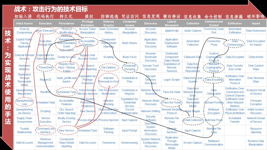 - 横轴是战术(Tactic),攻击行为的目标(WHY),例如持久化、提权。战术之间并没有严格的顺序关系,正如现实战斗中既有正面推进也有战术迂回。另外,并非所有的战术都会出现在实际攻击中。