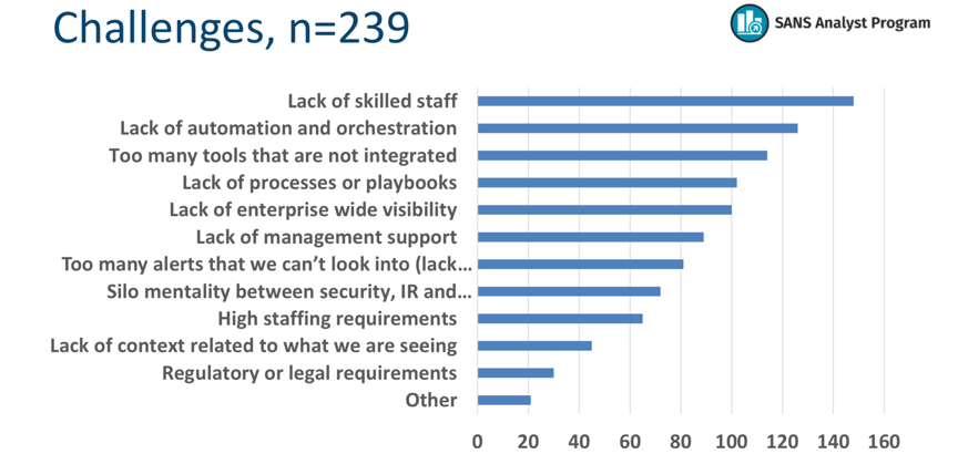 在与国内客户的沟通中,每当我提到全球最大信息安全培训机构 SANS 列举的 SoC 安全运营【4】面临挑战时(上图一),都能收获增强的具有本国特色的共鸣: