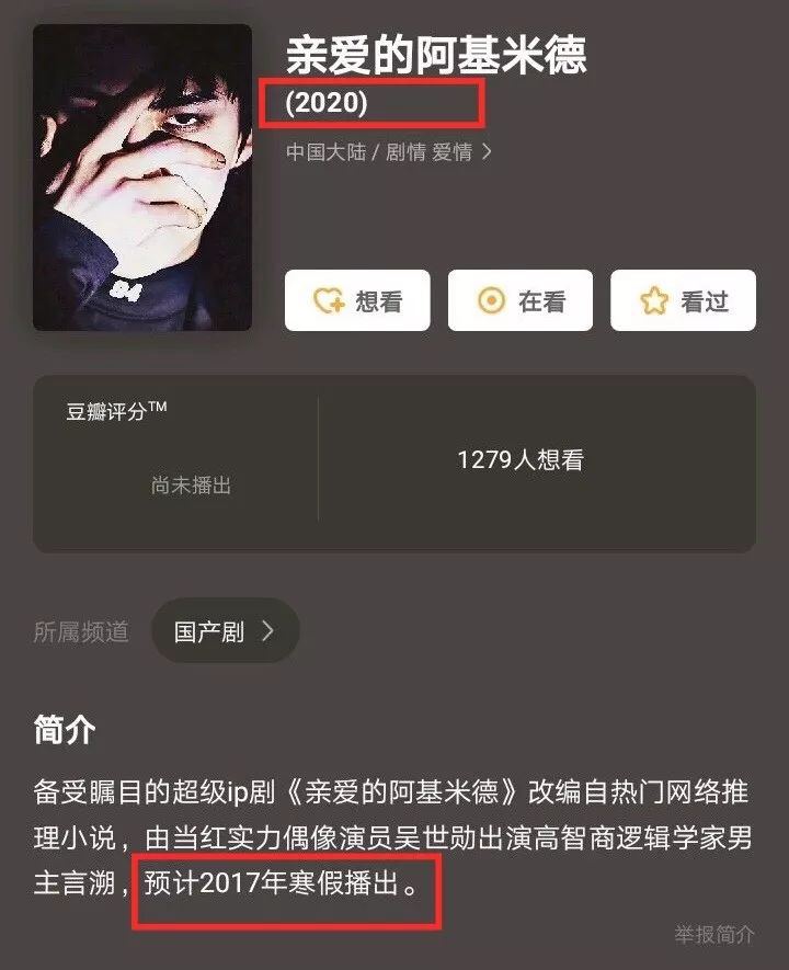 可以看到,据豆瓣显示,大部分待播的中韩合拍剧或将在2020年播出。但有些尴尬的是,有的剧集即使显示了待播时间,但相应时间线并未随之更新:吴世勋主演的《亲爱的阿基米德》,豆瓣显示2020年播出,但作品简介处却显示预计2017年寒假播出。# m* s4 @3 R5 a! y' T
