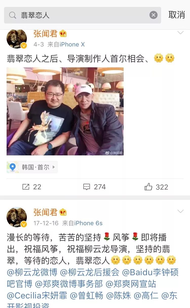 R/ I2 l2 W0 D2 i* K! x( A2 l+ t虽然官方宣传渠道几乎处在停歇状态,但从与作品紧密关联的出品方、制作人等方面的动态或可以管窥一些讯息。《翡翠恋人》的制片人张闻君更博频繁,直到2017年底仍发微博期待该剧能够上线,今年四月还与导演在韩国首尔见面,并回复剧粉评论表示“我和大家一样在等”。就在这两天,他的微博定位又出现在了韩国。可以试想,虽然各方明面上不再大肆宣传,但是并没有就此放弃作品,无不暗自期待、甚至勉力撮合剧集得以播出。1 E/ t# K) b8 o2 |0 m* n* {) j