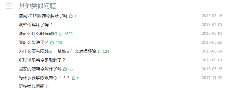 大众对于“限韩令”是否松绑仍抱有持久的关注,从2016年-2019年,相关话题、问题不断在网络平台被提及。3 |& Z% M3 F# a* }4 ^; A+ Y+ f