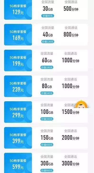 中国移动的5G套餐分为五个档,128元套餐包含30GB流量和500分钟通话,198元包含60GB流量和1000分钟通话,298元包含100GB流量和1500分钟通话,398元包含150GB流量和2000分钟通话,598元包含300GB流量和3000分钟通话。前6个月,中国移动根据不同套餐,会有套餐折扣和赠送语音通话优惠。