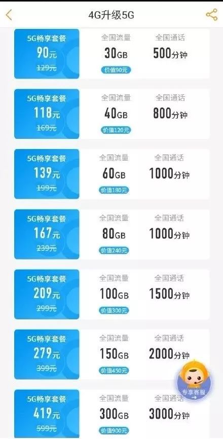 中国联通5G套餐价格从每月129元/30GB/500分钟通话,到599元/300GB/3000分钟通话六个档次。/ m1 D+ Q& s( x! }, a9 O