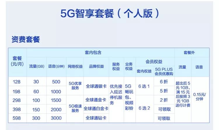中国移动5G套餐有五个档位,分别是128元套餐包含30GB流量和500分钟通话,198元包含60GB流量和1000分钟通话,298元包含100GB流量和1500分钟通话,398元包含150GB流量和2000分钟通话,598元包含300GB流量和3000分钟通话。# N5 _/ ]; ~& F8 k5 f5 M4 K