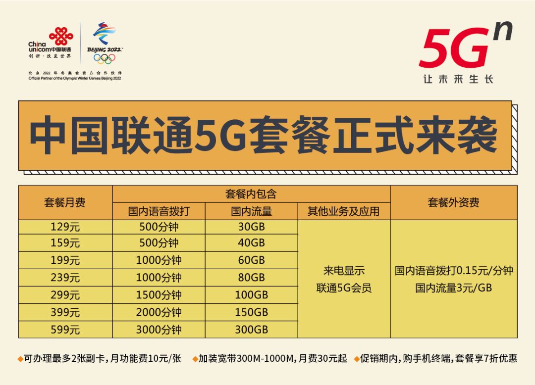 / m2 o1 f9 G9 \- }新鲜出炉的5G套餐分7个档位,分别为129元、159元、199元、239元、299元、399元和599元,包含的流量从30GB-300GB不等。9 h Y& ]3 j* P9 K. n8 b @; Z
