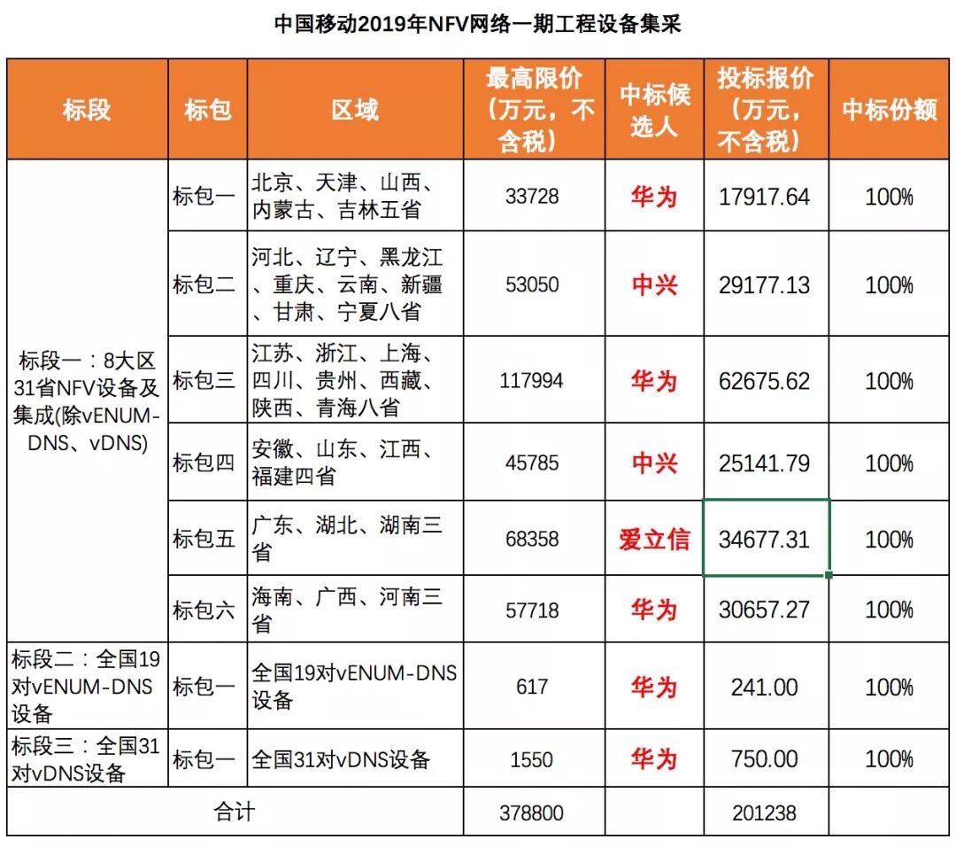 , ?2 V, A o) k7 W! X( i+ i$ n- Y11月1日,中国移动发布中标候选人公示,中标候选人的投标报价及中标情况如下:4 \. R. k% {: T' P3 B; n, ^
