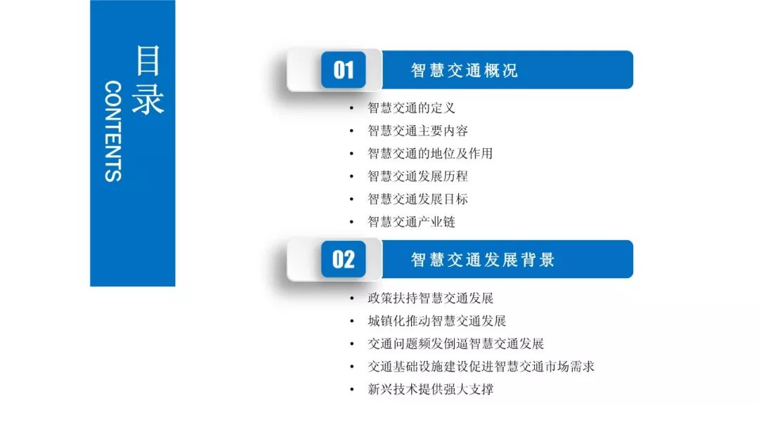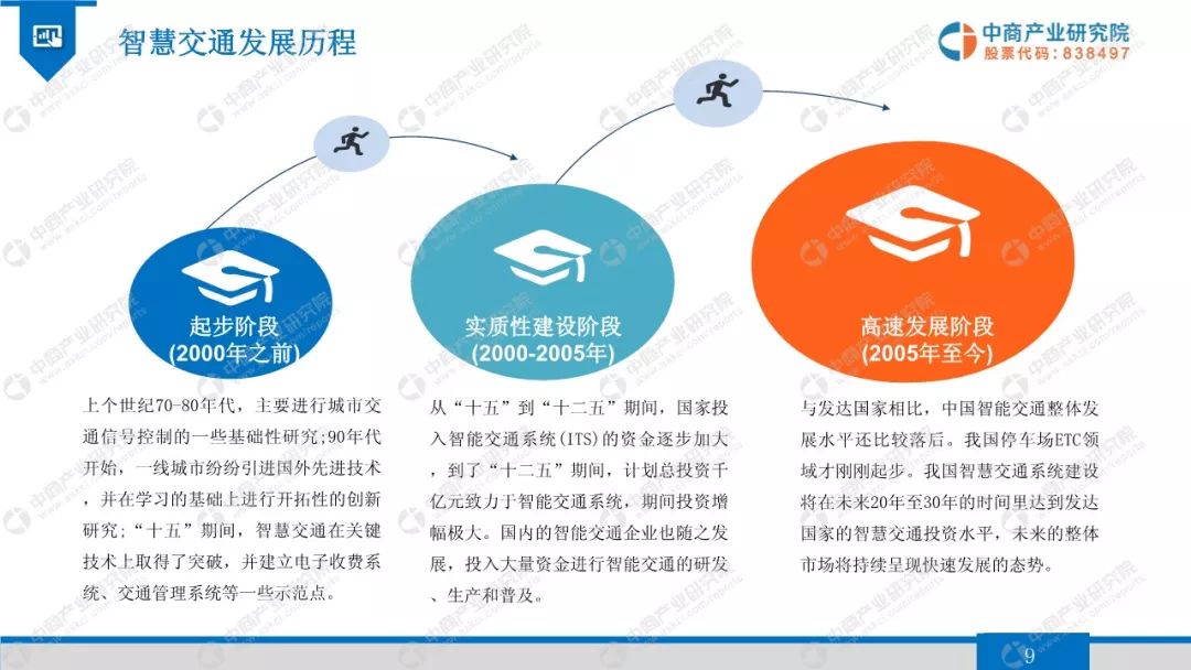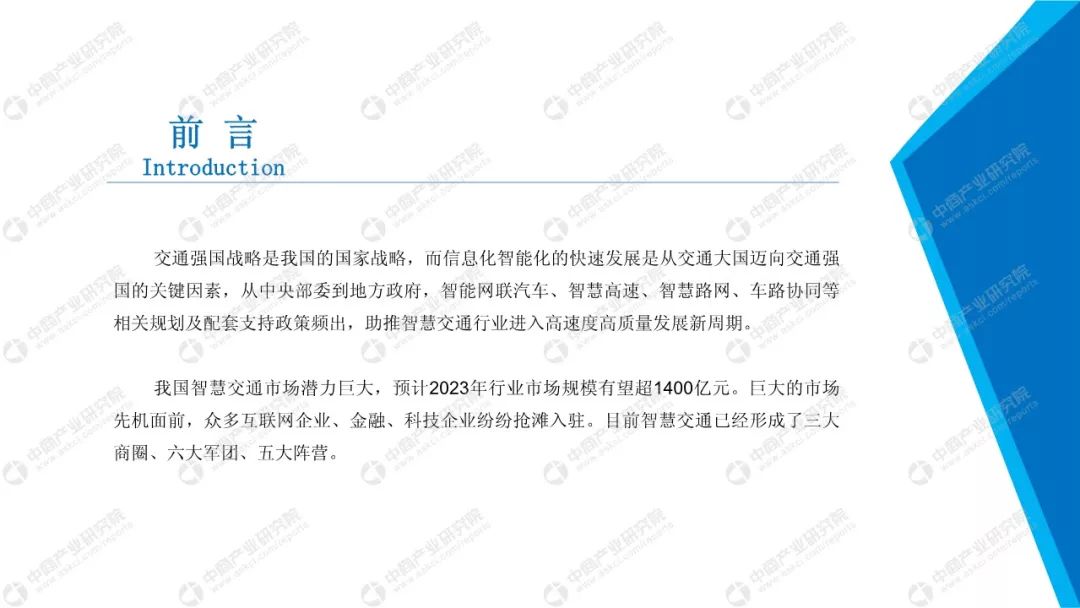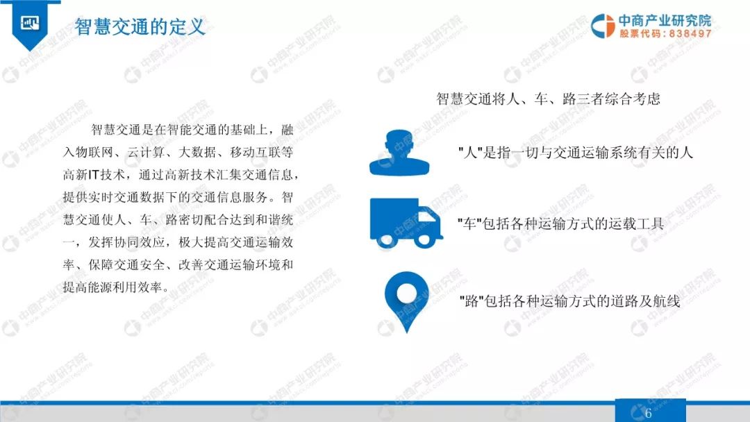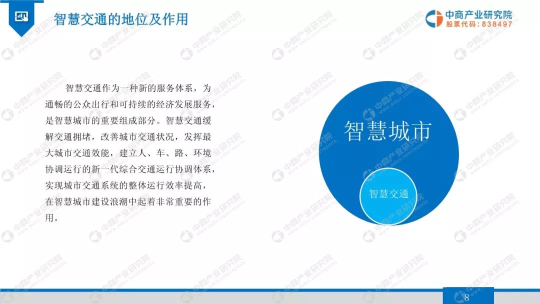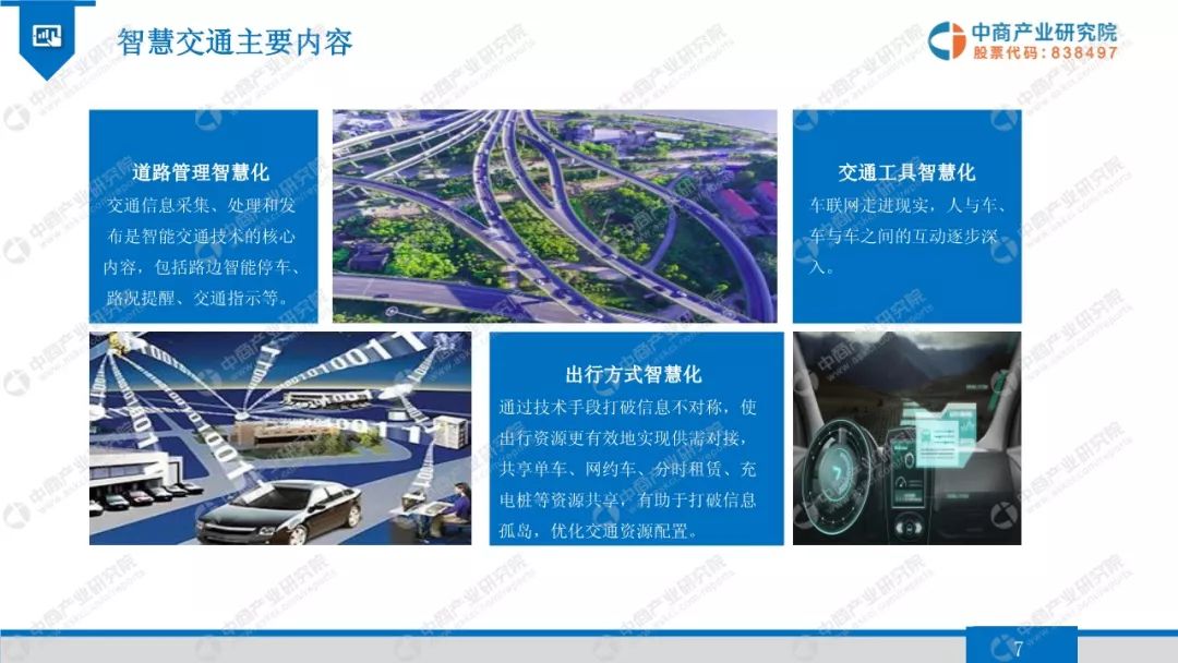 ! ^4 v0 p8 G9 n0 G" H2 X智慧交通是智慧城市重要内容,受到国家和资本的强势关注。为了让大家更好的了解智慧交通,中商产业研究院发布了《2019年智慧交通行业市场发展前景及投资研究报告》,报告从七大方面分析智慧交通概况、智慧交通发展背景、交通行业发展现状、智慧交通行业现状分析、智慧交通应用场景、智慧交通行业重点企业分析、智慧交通行业发展前景,报告最后附中国智慧交通企业名单。1 y' D- D8 Z1 M+ h/ k1 S