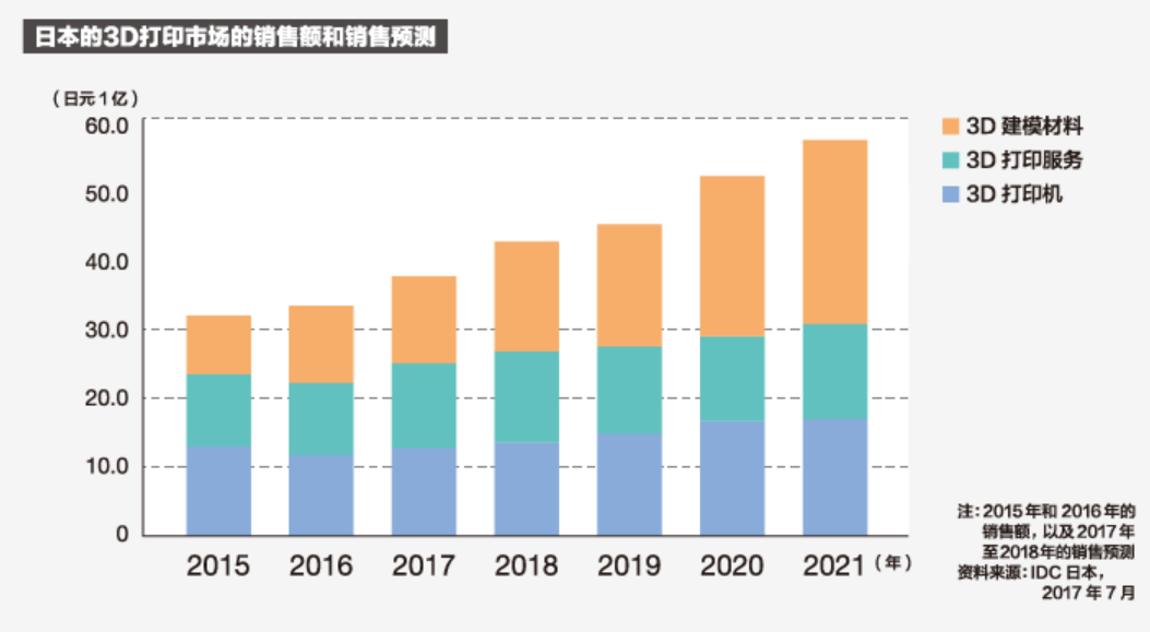 日本在全球制造业中排名前五,根据IDC日本的统计数据,2019年日本3D打印市场销售额达到400多亿日元。预计到2021年,3D打印市场的销售和销售预测将超过500亿日元(约4.6亿美元)。制造、汽车、航空航天、医疗和其他行业需要3D打印相关解决方案。