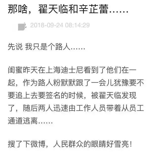 到了2018年,网上开始传出两人相恋的绯闻。有网友称朋友在上海迪士尼乐园看到翟天临和辛芷蕾共同出游,正准备上前要签名,却被翟天临先一步发现,随后二人迅速由工作人员带着从员工通道离开。也许是当初两人才刚刚开始发展恋情,不想被外界打扰。+ O2 M a4 a. ~0 b: O0 x* S5 Q