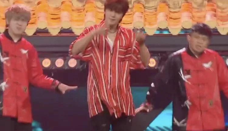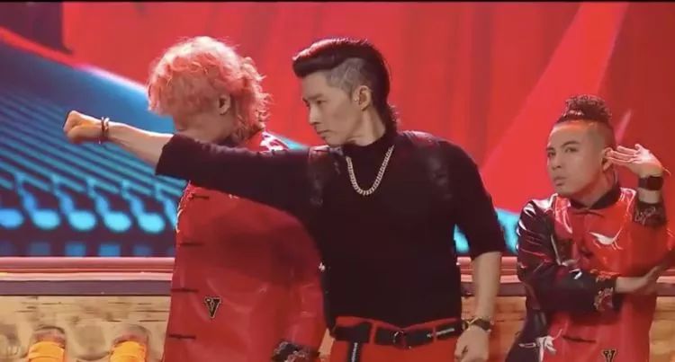 韩庚的造型就比较收敛一点,穿着大红色外套,内搭也是黑色,跳舞的时候有种诙谐感,很轻松,表情也没有狠劲儿。