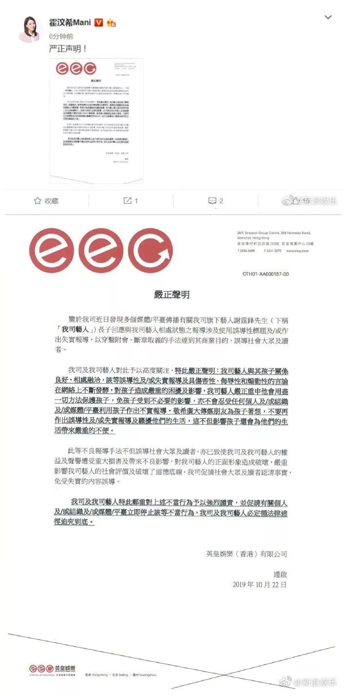 谢霆锋的经纪人霍汶希发布严正声明,全文大意是——