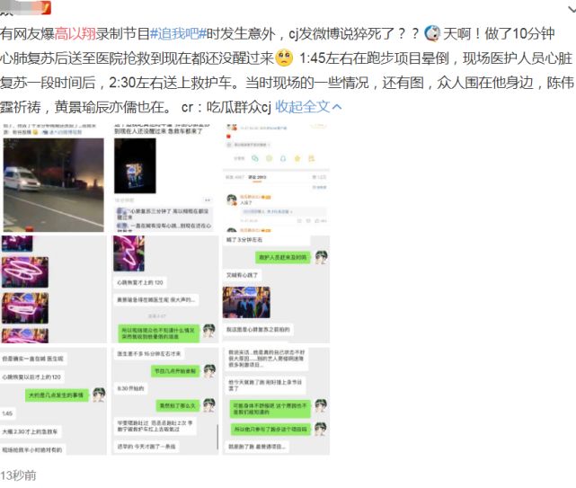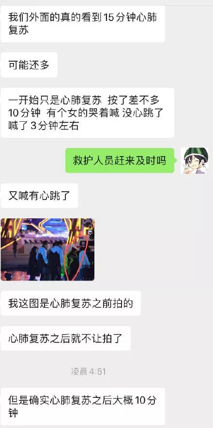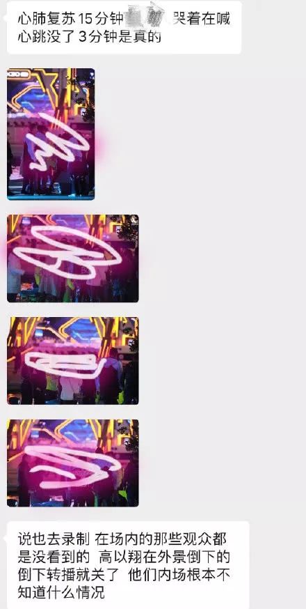 关于心肺复苏,现场粉丝称“一开始只是心肺复苏,按了差不多10分钟,有个女的哭着喊,没心跳了喊了3分钟左右……随后又喊有心跳了!”- d! I" l; I; r" t. E