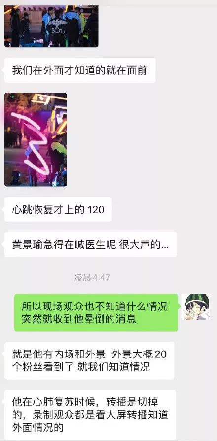 , W" G7 Y s" u2 g聊天记录中称,高以翔在心跳恢复后上了救护车,录制分为内场和外景,外景大约有20多个粉丝看到了高以翔的情况,而爆料人称黄景瑜当时很着急,在大声地喊医生。