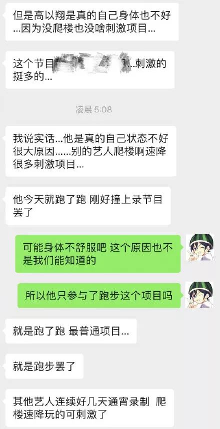 # Z( h8 `) r9 g& X* w f爆料者也称高以翔是“真的身体不好,状态也不好……”而其他艺人还有别的刺激项目,高以翔只是跑了步。/ }8 P5 q# P8 C2 G |