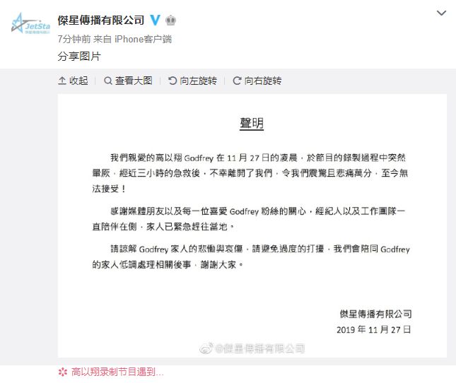 高以翔经纪公司也发布了消息。