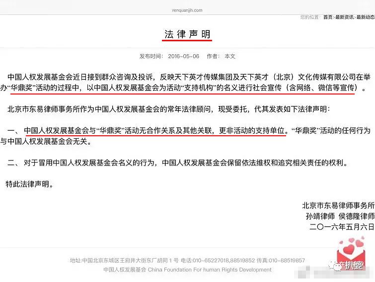 * Z4 n! ^' H$ S; f: }& c0 X- @4 X' F很快中国人权发展基金会发了律师声明,内容是澄清自己和华鼎毫无合作关系,并且保留被当成招摇撞骗工具的维权和追究权。