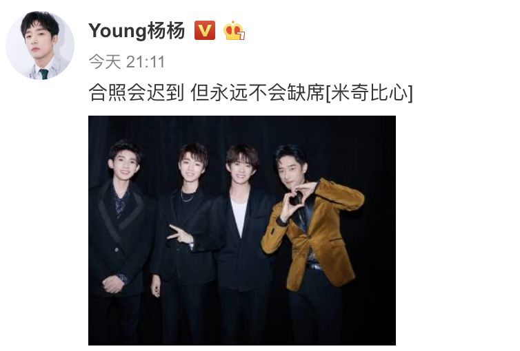 ( l0 s; A5 i! q: y3 J/ u12月12日,主持人杨杨晒出他和TFBOYS的合照,发文:合照会迟到,但永远不会缺席!据悉,杨杨主持了音乐娱乐盛典,当天和TFBOYS同台了,而这张合照也是在当天拍摄的。
