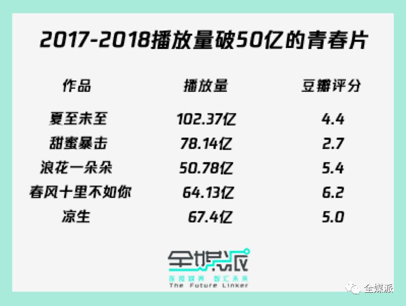其实,《青春斗》仅是冰山一角,从去年开始,青春剧的扑街颓势就已见端倪。2017-2018年播放量破50亿的青春剧中,豆瓣评分最高的《春风十里不如你》也只有6.2分,而即便是赶在鹿晗和关晓彤公布恋情后上映的《甜蜜暴击》,播放量虽高达78.14亿,豆瓣评分却只有2.7分,收视更是一片惨淡;同样播放数据超高的《夏至未至》,豆瓣评分也低至4.4;另一方面,口碑最好的《忽而今夏》播放量却仅有18.71亿。青春剧市场上,口碑与热度齐飞的爆款已经许久没有出现。0 x, p1 m1 h8 E& z; K+ t: E