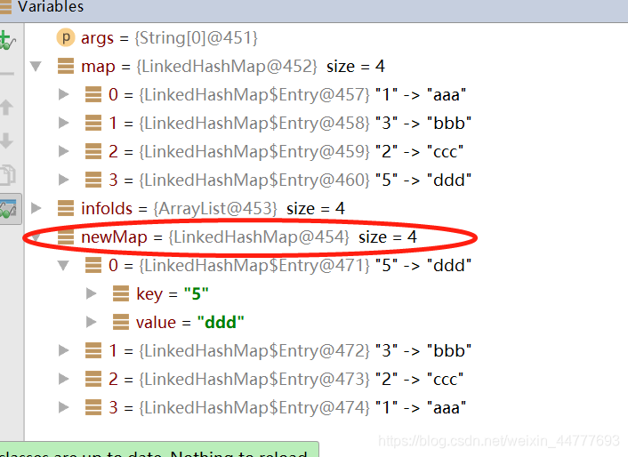 对LinkedHashMap按key进行降序排序 public static void main(String[] args) { LinkedHashMap<String,String> map = new LinkedHashMap<String,String>(); map.put("1","aaa"); map.put("3","bbb"); map.put("2","ccc"); map.put("5","ddd"); List<Map.Entry<String, String>> infoIds =new ArrayList<Map.Entry<String, String>>(map.entrySet()); //排序 Collections.sort(infoIds, new Comparator<Map.Entry<String, String>>() { public int compare(Map.Entry<String, String> o1, Map.Entry<String, String> o2) { String p1 = o1.getKey(); String p2 = o2.getKey();; return Integer.valueOf(p2)-Integer.valueOf(p1);//如果要升序, 改为return Integer.valueOf(p1)-Integer.valueOf(p2); } }); //转换成新map输出 LinkedHashMap<String, String> newMap = new LinkedHashMap <String, String>(); for(Map.Entry<String,String> entity : infoIds){ newMap.put(entity.getKey(), entity.getValue()); System.out.println(entity.getKey()); } } debug后的截图,已经降序排好
