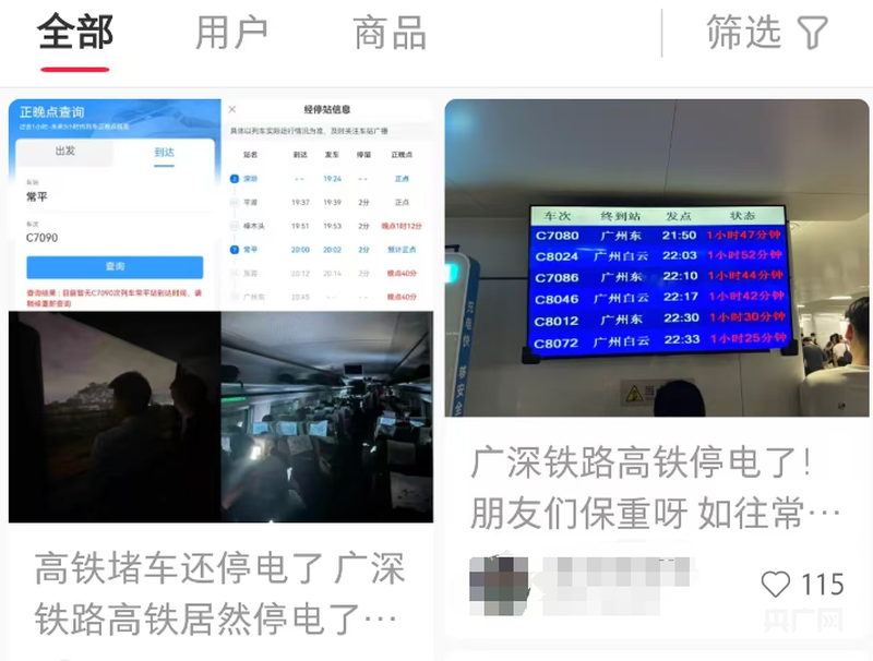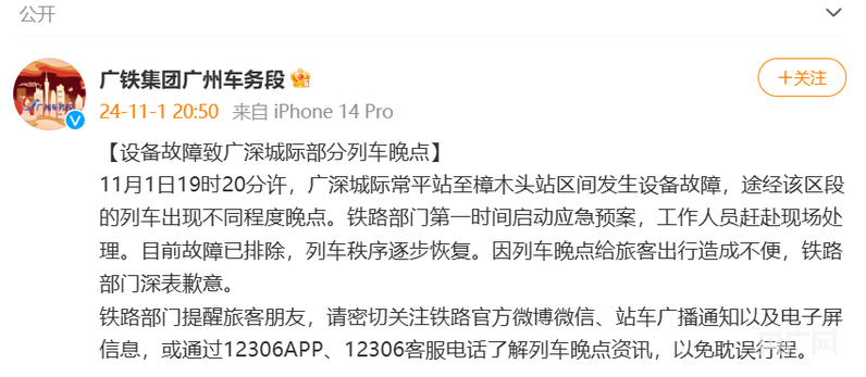 央广网广州11月2日消息(记者罗世伟 见习记者郑少纯)11月1日晚,有市民通过社交平台反映称,多趟广深城际列车晚点。市民拍摄的列车发车时间显示,普遍晚点1小时以上,有列车晚点近2小时。 有市民通过社交平台反映多辆广深城际列车晚点(央广网发 图片来自某社交平台) 当晚,认证为“中国铁路广州局集团有限公司广州车务段”的“广铁集团广州车务段”微博发文,称设备故障致广深城际部分列车晚点。 广铁集团称设备故障致广深城际部分列车晚点(央广网发 图片来自“广铁集团广州车务段”微博) 其发布的内容显示:11月1日19时20分许,广深城际常平站至樟木头站区间发生设备故障,途经该区段的列车出现不同程度晚点。铁路部门第一时间启动应急预案,工作人员赶赴现场处理。目前故障已排除,列车秩序逐步恢复。因列车晚点给旅客出行造成不便,铁路部门深表歉意。 来源:https://view.inews.qq.com/k/20241102A069WH00 免责声明:如果侵犯了您的权益,请联系站长,我们会及时删除侵权内容,谢谢合作! |