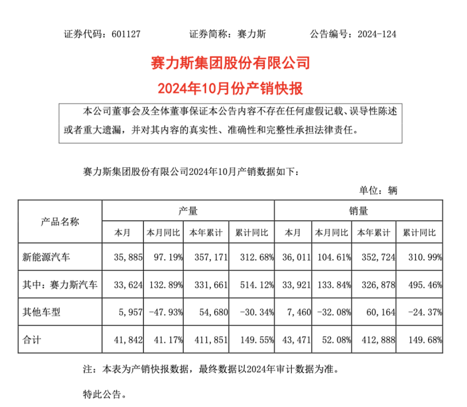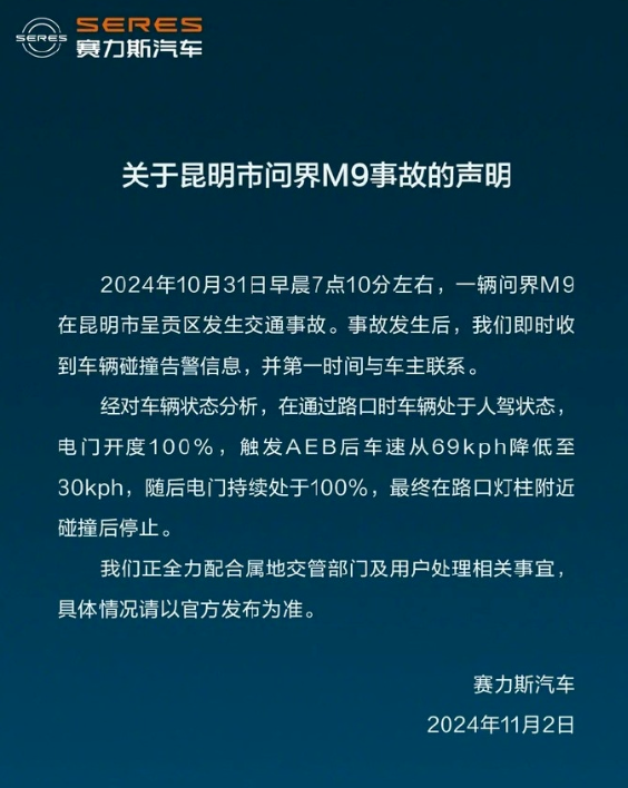 赛力斯冲上热搜。 赛力斯回应昆明问界M9事故 赛力斯汽车今日发布有关“昆明市问界M9事故”的声明,表示正全力配合属地交管部门及用户处理相关事宜,具体情况请以官方发布为准。 10月31日,在云南昆明锦绣大街,一辆问界M9在进入路口的时候,差点剐蹭到其他车辆。随后紧急刹车,撞到一辆等红灯的轿车后,一路加速冲入车流。 声明指出,2024年10月31日早晨7点10分左右,一辆问界M9在昆明市呈贡区发生交通事故。事故发生后,即时收到车辆碰撞告警信息,并第一时间与车主联系。 经对车辆状态分析,在通过路口时车辆处于人驾状态,电门开度100%,触发AEB后车速从69kph降低至30kph,随后电门持续处于100%,最终在路口灯柱附近碰撞后停止。 赛力斯10月销量爆发 11月1日晚间,赛力斯(601127)发布10月产销快报。数据显示,赛力斯新能源汽车10月销量达36011辆,同比增长104.61%;今年1—10月,赛力斯新能源汽车累计销量已达到352724辆,同比增长310.99%。 今年以来,问界系列产品矩阵持续扩容、新品迭代升级,问界新M5、新M7Pro、问界M9五座版相继上市。截至目前,问界M9上市10个月累计大定超16万辆,连续6个月蝉联50万元以上豪华车型销量第一,持续刷新中国新能源汽车品牌新纪录。 三季度业绩大增 10月30日晚间,赛力斯(601127)发布2024年第三季度报告。 公告显示,前三季度,赛力斯营收为1066.27亿元,同比增长539.24%;净利润为40.38亿元,同比扭亏。其中,2024年第三季度,赛力斯净利润为24.13亿元。 对于业绩和净利润增长的原因,赛力斯公告称,前三季度净利润增长主要系公司销量及营业收入持续增长;产品结构调整,高价值产品的销售规模增长所致。同时,赛力斯坚持技术创新、价值贡献的经营方针,生产经营全链条精细化管理,使得产品毛利率同比增加。 来源:https://view.inews.qq.com/k/20241102A0610800 免责声明:如果侵犯了您的权益,请联系站长,我们会及时删除侵权内容,谢谢合作! |