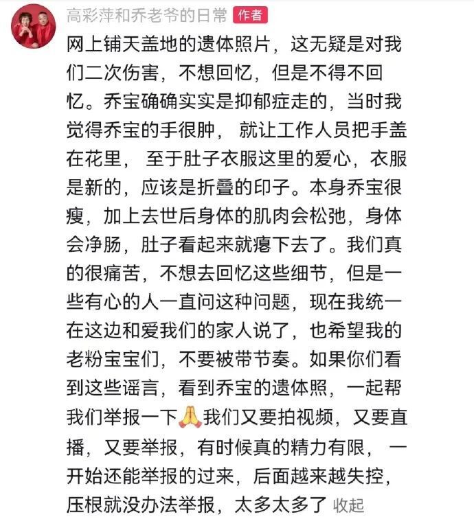 2016年9月16日晚 娱乐圈传来一则噩耗 演员兼歌手乔任梁 因抑郁症于家中自杀去世 时间过去多年 围绕乔任梁的相关话题 一直在网络上存在 近日 关于“乔任梁死因”的传闻再起 并有其遗体照片流出 10月31日 话题“乔任梁父母发声” 登上热搜榜单 乔任梁的父母通过个人社交媒体发文表示:“网上铺天盖地的遗体照片,这无疑是对我们二次伤害,不想回忆,但是不得不回忆。乔宝确确实实是抑郁症走的,当时我觉得乔宝的手很肿,就让工作人员把手盖在花里……我们真的很痛苦,不想去回忆这些细节,但是一些有心的人一直问这种问题,现在我统一在这边和爱我们的家人说了,也希望老粉们不要被带节奏。” △乔任梁父母 此前的10月15日,乔任梁的父母@高彩萍和乔老爷在个人社交账号上发文悼念乔任梁,并祝儿子生日快乐,“乔宝,生日快乐,爸爸妈妈、朱桢、粉丝朋友们都来了。” 同日,乔任梁生前好友朱桢也在个人社交账号发文怀念好友乔任梁:“八年,别来无恙。” 然而评论区却出现关于乔任梁和朱桢的负面传闻,朱桢回复此条评论:“发的人是谁,请他和我‘对线’,别躲在暗处。” △朱桢与乔任梁父母合影 对于该传闻,乔任梁父母也多次在评论区回应,“不信谣、不传谣,希望大家不要被有心之人利用。”“朱桢对我们的付出,相信你们有目共睹。” 31日凌晨,朱桢曾发文表示,“拿一张不知来路的截图,我都无从告起。”“请离开我的世界,我什么都不在意。” 当日,朱桢再次回应传闻,表示自己会去报警。 评论区有不少网友 纷纷表示相信和安慰 “支持报警, 这些黑心的人别太嚣张了” “网络不是法外之地, 支持维权” 乔任梁,1987年10月15日出生于中国上海市,毕业于上海电机学院。中国内地男演员、歌手。乔任梁热衷公益事业,积极参加了多场公益晚会和赈灾义演。2016年9月16日,乔任梁因抑郁症在上海家中去世,年仅28岁。 朱桢,1978年11月4日出生于上海,毕业于上海戏剧学院,中国内地男主持、演员。 来源:东方网综合当事人社交账号、新黄河、九派新闻、网友评论等 视频:孔文龙 编辑:宋世平 审稿:钱程灿 来源:https://view.inews.qq.com/k/20241031A088UH00 免责声明:如果侵犯了您的权益,请联系站长,我们会及时删除侵权内容,谢谢合作! |
