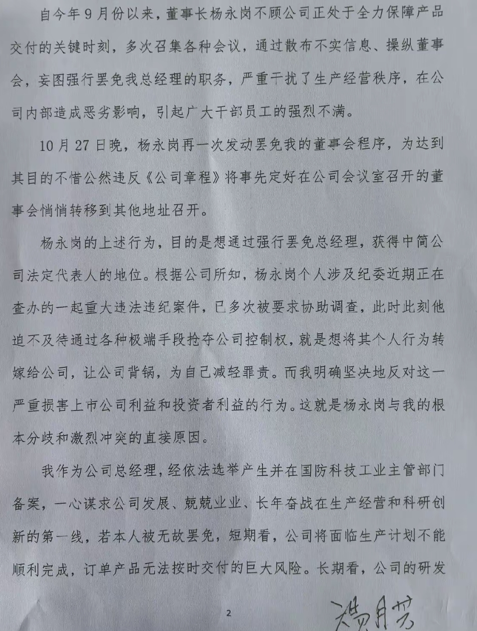 航空碳纤维龙头中简科技(300777.SZ)创始人之间的内斗继续升级。 11月1日晚,中简科技连发多份公告,涉及公司公章及法人章作废、解聘公司总经理温月芳等事项。 中简科技称,近期因经营层保管不利,遗失公司公章(备案编号:3204000049119)及法定代表人章(备案编号:3204000049123)各一枚。现均声明作废。公司已向公安机关备案,将尽快进行公章、法人章印鉴的补办手续,上述事项不会对公司未来生产经营造成重大不利影响。 同时,该公司披露,于11月1日召开了第三届董事会提名委员会第五次(临时紧急)会议、第三届董事会第十七次(临时紧急)会议,审议通过了《关于解聘公司总经理温月芳的议案》。 根据第三届董事会第十七次(临时紧急)会议决议,温月芳因个人原因不再适合担任公司总经理一职,公司董事会解聘温月芳的公司总经理职务;在聘任新的总经理之前,由董事长杨永岗暂代公司总经理职务,并依据《公司章程》担任公司法定代表人,主持公司日常经营工作。解聘自本次董事会审议通过之日起生效。解聘后,温月芳将继续担任公司副董事长、总工程师的职务以及仍担任公司第三届董事会战略与发展委员会委员。 中简科技称,此次解聘事项不会对公司日常生产经营活动的正常运作产生重大不利影响。公司各项工作稳步推进,按照既定目标全力以赴保障供货。截至公告披露日,温月芳直接持有公司股份944.32万股,占公司股份总数的2.15%。 11月1日,中简科技还发布两份董事会决议公告。第三届董事会第十六次会议决议公告显示,于10月27日向全体董事发出会议通知,并于10月30日以现场会议结合通讯方式召开,会议应参加表决董事7人,实际参加表决董事5人,董事温月芳、彭纪生缺席会议。 该次董事会审议通过了《关于修订<中简科技股份有限公司董事会提名委员会工作细则>及调整提名委员会组成的议案》。其中,公司董事会同意将提名委员会委员调整为李友根(召集人)、沈菊琴、李宝山。 随后,中简科技于11月1日举行第三届董事会第十七次会议,并审议通过了《关于解聘公司总经理温月芳的议案》。决议公告显示,针对该议案,董事温月芳、彭纪生投反对票。 温月芳董事质疑提名委员会委员的组成,质疑董事会秘书履职的合法性;其认为提名委员会解聘总经理理由不成立,着重阐述了其本人对公司的贡献,并认为其本人在公司具有不可替代的作用,是中简最适合的总经理人选。彭纪生认为相关董事会召集程序存在瑕疵,其本人通过和公司的多次合作,认为温月芳是一名合格且优秀的总经理,其对公司非常重要。 11月1日下午,简介为“中简科技法定代表人、总经理、副董事长兼总工程师”的“温月芳”个人自媒体账号连发三条讯息,其中两条涉及中简科技近期内斗事宜。界面新闻从知情人士处获悉,该个人账号信息为真,确属于温月芳本人。 温月芳称,自今年9月份以来,中简科技董事长杨永岗不顾公司正处于全力保障产品交付的关键时刻,多次召集各种会议,“通过散布不实信息、操纵董事会,妄图强行罢免温月芳总经理的职务,严重干扰了生产经营秩序,在公司内部造成恶劣影响,引起广大干部员工的强烈不满”。 10月27日晚,杨永岗再一次发动罢免温月芳的董事会程序,并将事先定好在公司会议室召开的董事会悄悄转移到其他地址召开。 温月芳认为,“杨永岗的上述行为,目的是想通过强行罢免总经理,获得中简公司法定代表人的地位。根据公司所知,杨永岗个人涉及纪委近期正在查办的一起重大违法违纪案件,已多次被要求协助调查,此时此刻他迫不及待通过各种极端手段抢夺公司控制权,就是想将其个人行为转嫁给公司,让公司背锅,为自己减轻罪责。” 温月芳称,“中简公司的生产经营不会因为离开杨永岗而受到影响”。“我作为公司总经理,经依法选举产生并在国防科技工业主管部门备案,一心谋求公司发展、兢兢业业、长年奋战在生产经营和科研创新的第一线,若本人被无故罢免,短期看,公司将面临生产计划不能顺利完成,订单产品无法按时交付的巨大风险。长期看,公司的研发创新将陷入停顿,产品的升级换代被迫中止,大大影响中简公司的未来发展和核心竞争力。” 温月芳称,2008年公司成立之后,作为中简公司的创始人之一,其负责公司技术工艺研发、生产现场管理、产品质量控制、用户订单交付等工作,是公司唯一全面握聚合、溶剂回收、纺丝、氧化碳化全链条核心技术的人。 界面新闻了解到,杨永岗和温月芳签订了《一致行动协议》,为一致行动人,二人共同控制公司,是公司的实际控制人。截至2024年9月30日,杨永岗、温月芳分别持有中简科技股份2.47%、2.15%;二人共同持有中简科技持股13.8%的第一大股东常州华泰投资管理有限公司60.16%的股份,可支配其表决权;杨永岗为常州市中简投资合伙企业(有限合伙)普通合伙人,后者持股3.36%,可支配其表决权。 公开信息显示,杨永岗于1967年4月出生,2008年4月至2015年9月任中简有限董事、总经理,2015年9月至2019年10月15日任公司董事长、总经理,2019年10月16日至今任公司董事长。杨永岗长期从事高性能聚丙烯腈基和粘胶基碳纤维及其复合材料的研究与产业化工作。 温月芳于1965年12月出生,2008年4月自公司成立以来,温月芳历任公司董事、常务副总经理、总工程师、总经理。温月芳长期从事聚丙烯腈基碳纤维的科研及产业化工