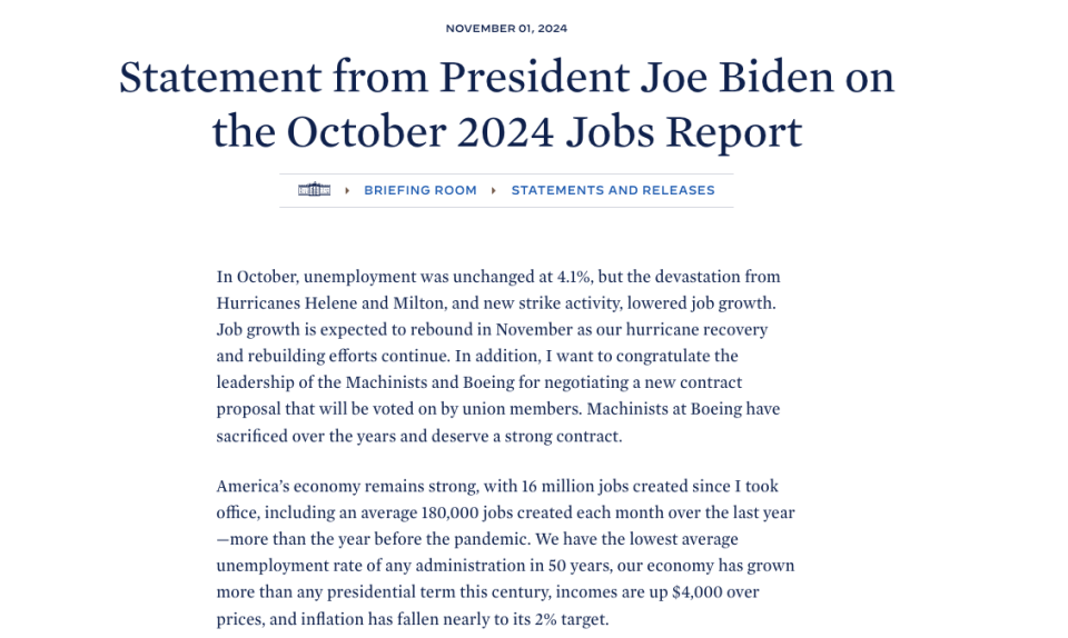 财联社11月1日讯(编辑 史正丞)随着美国10月非农就业数据以颇具戏剧效果的方式展开,市场各方对于数据本身,以及各种衍生话题进行了各种角度的解读。 首先作为前情提要,周五刚刚公布的非农只有区区1.2万。虽然有两场大飓风、波音罢工的影响,但这个数字全面击穿了市场的预期(11.3万)。更有趣的是,失业率从4.05%上升至4.14%,四舍五入一下便都是“4.1%”。 对于资本市场而言,也乐于见到巩固美联储降息周期的数据。截至发稿,美股三大指数涨幅均超1%。 更有趣的是,还是各路人马对于同一个数据的不同解读方式。 拜登:记住!我创造了1600万就业 按照惯例,乔·拜登总统的办公室,继续针对非农数据发表声明。这篇稿子,仅用“就业缓慢”一笔带过“1.2万”的事情。 (来源:白宫)拜登在声明中表示,10月份失业率保持在4.1%不变,但由于飓风和罢工导致就业缓慢,预期11月会出现反弹。之后,即将退休的拜登特意强调,在他任内一共创造了1600万就业,平均每个月18万,同时他任内的失业率也是近50年来最低的。 毫无疑问,特朗普团队第一时间就挥舞着就业报告砸向哈里斯。特朗普发言人卡罗琳·莱维特在声明中表示,周五的就业增长是“灾难”,该报告明确揭示了“卡马拉·哈里斯如何严重破坏美国经济”。 虽然投资者们都很清楚,数据糟糕的原因与灾害更大一些。特朗普的盟友们一直在指责拜登政府为了政治利益“操纵就业数据”,白宫对此矢口否认。 然而,这份就业数据里的确有一系列巧合,值得品评一番。 别忘了还有“美式下修” 需要注意的是,虽然一直在强调飓风、罢工等因素,但绝大多数知道有这两大因素的机构也全部预测失误——根据统计,市场的一致预期在11.3万。同时在所有公开预测中,只有彭博经济(-1万)和荷兰银行(0万)的预期低于最终值。 令市场感到习惯性困惑的是,美国劳工部这次又下调了前两个月的就业数据,8月下调8.1万、9月下调了3.1万。根据统计,拜登劳工部在今年前9个月的非农数据发布后,有7个月后续进行下修,累计抹掉81.8万个就业岗位。 这也意味着11月和12月的非农报告将有一个看点——10月区区1.2万的数据,如果再下调一下,可不就变成负的了嘛! 更重要的细节在于,虽然10月非农的数据勉强为正,但如果排除掉4万政府新增岗位,实际上的私营就业还是负的,而且是2020年12月以来首次转负。 至于劳动数据统计部门特别强调的“无法量化飓风影响”,知名金融博客ZeroHedge做出了一番颇有阴谋论味道的“翻译”:到下个月发布数据时,如果特朗普当上总统,那么就维持就业的下行趋势,等同于“承认劳动力市场的真实状态”;但如果哈里斯赢了,那就给一个数据的“神奇反弹”,即便需要更猛烈的“下修操作”。 普遍论调:先确认下周降息定了 对于华尔街分析师们来说,周五的数据更多是“一次性意外”,没办法咀嚼出有关经济和降息的更多见解。 信安环球投资的全球首席策略师Seema Shah表示,对数字的深入思考表明,在所有的噪音和干扰之下,劳动力市场基本上正在放缓。新增10万个就业岗位的共识预测已经考虑了飓风的影响,因此显著的下行意外表明潜在的疲软。这重申了美联储必须坚持其宽松周期,11月和12月可能会降息25个基点。 安联投资管理的投资组合管理副总裁Charlie Ripley表示,总的来说,这份报告没有太多信息可以用来判断劳动力市场的走势,这使得美联储有望在下周降息25个基点。看来我们还需要再等一个月的经济数据,以更好地评估美联储的货币政策走向。 成功预测今夜数据的彭博经济首席美国经济学家Anna Wong表示,排除暂时性因素并调整数据中的夸大来源,基础就业增长可能低于稳定失业率所需的速度,预计失业率将在未来几个月恢复上升。十月就业报告将使得美联储在11月7日按计划降息25个基点。 精品财富管理公司Glenmede的私人财富管理首席投资官Jason Pride表示,投资者应对这份报告保持谨慎,因为在未来几个月内可能会有较大修订。美联储没有太多清晰的指标,但一些基础数据似乎足够良好,使得他们可以在下周进行25个基点的降息。 Pride预测,在没有重大干扰的情况下,未来的基准情况应该是年内再降息50个基点,并在2025年进一步降息,年中时稳定在3%-3.5%区间。 (财联社 史正丞)来源:https://view.inews.qq.com/k/20241101A0AAKQ00 免责声明:如果侵犯了您的权益,请联系站长,我们会及时删除侵权内容,谢谢合作! |