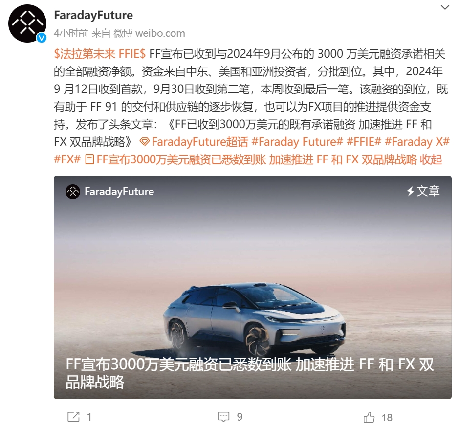 每经编辑:张锦河 10月31日,法拉第未来(FFIE,股价2.03美元,市值2513.2万美元)在微博发文宣布,已收到与2024年9月公布的3000万美元(约合人民币2.1亿元)融资承诺相关的全部融资净额。 公司称,资金来自中东、美国和亚洲投资者,分批到位。其中,2024年9月12日收到首款,9月30日收到第二笔,本周收到最后一笔。该融资的到位,既有助于FF 91的交付和供应链的逐步恢复,也可以为FX项目的推进提供资金支持。 截至发稿前,法拉第未来美股盘前上涨超11%。 贾跃亭:FX的执行计划可以加速推进了,力争成为AIEV时代的丰田同日,贾跃亭也在微博发布视频称,“FF上一轮的3000万美金的融资,最后一笔资金已经到账,本轮融资已正式完成,FF梦想实现战再次取得重大的进展。” “3000万美金对传统车企可能不算很多,但对于FF和采用‘四轻四快’模式的FX战略意义重大,尤其是FX的执行计划可以加速推进了。近期有消息称Tesla(特斯拉)将取消2.5万美元平价电动车的计划,我认为这对美国AIEV市场的发展是非常大的损失,美国汽车产业也要像中国汽车产业一样大力推广2.5万美元以下的AIEV产品,才能够快速实现产业的变革。 产业需要、市场需要、用户需要,Tesla不做,那必须要有人做,这更加凸显了我们FX战略的巨大潜力和必要性。目前美国的汽车企业还尚未能有效解决新能源汽车用户的几大根本痛点:购车成本、使用成本以及里程焦虑,我相信FX售价2到3万美元的车型,以及增程加纯电两类产品的结合,将会很好地解决以上的痛点。 FX的使命是在美国市场打造并普及‘两倍性能,一倍价格’的极致性价比AIEV,力争成为AIEV时代的丰田。”他说。 贾跃亭:国内债务大约还有20亿美元,计划两年内还清回国近日,贾跃亭在接受采访时透露,目前在国内的债务大约还有20亿美元,当下最大的使命和任务,就是要快速的真正的把 FF 做成,然后尽快的还债,尽快的回国。究竟何时能还完债回国?贾跃亭给出了新的期限:“我认为可以以两年为限。” 10月16日,贾跃亭曾发布视频谈FF第二品牌Faraday X(FX)的使命。 贾跃亭表示,“FX存在的使命,不是去和Tesla(特斯拉)简单地竞争,更多的是做Tesla没做到的事情。作为新能源产业的鼻祖,美国这几年却恰恰反而和中国发展速度完全倒挂了。 4万到6万美金之间有个巨大的空白,就是增程的空白,所以我们既做Tesla价格之下的,也做Tesla同价位区间的。我们对外公布的主要三个价位段是2万-3万的,3万-5万的和5万-8万的,是现在的空白区、蓝海市场,我们全力以赴来切入这块市场。把FF和FX两者充分化学反应之后,到底能产生什么样的价值。” 图片来源:贾跃亭微博 据FF官方数据显示,FF 2023全年共交付10辆FF 91 2.0 Futurist Alliance,2024年2月7日,FF宣布对外交付1辆FF 91 2.0 Futurist Alliance。加上6月与8月交付的两辆车,至此贾跃亭造车10年已交付13辆车。 每日经济新闻综合自贾跃亭、FF微博、公开信息 免责声明:本文内容与数据仅供参考,不构成投资建议,使用前请核实。据此操作,风险自担。 每日经济新闻 来源:https://view.inews.qq.com/k/20241031A089BQ00 免责声明:如果侵犯了您的权益,请联系站长,我们会及时删除侵权内容,谢谢合作! |