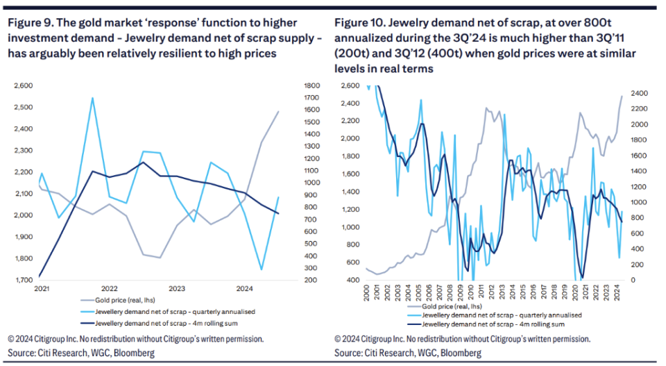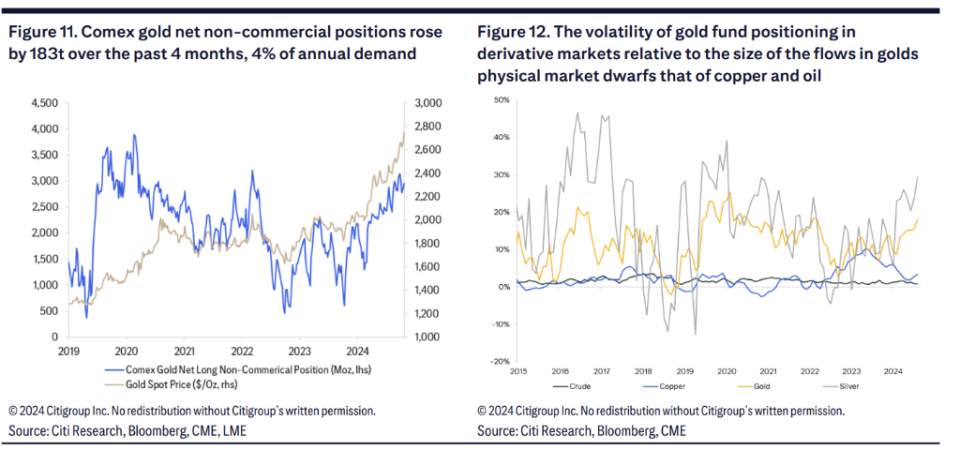 在地缘政治冲突和降息预期的背景下,金价今年以来屡破历史新高,2760美元/盎司、2770美元/盎司、2780美元/盎司……迫使华尔街各大行在不断“打脸”中上调目标价。 当前,市场的焦点无疑是,金价本轮上涨的终点在哪里?根据华尔街见闻的梳理,花旗、高盛、瑞银、美银等多家华尔街大行对未来金价走势已基本达成共识——明年涨至3000美元/盎司,较当前金价上涨近9%。大摩更为激进,预计金价将在明年第一季度上探至3100美元/盎司。 避险需求是推动金价上涨的主要因素之一。高盛此前报告指出,自俄乌冲突爆发以来,全球央行对黄金的需求已增长了四倍。美银指出,在美国大选不确定性下和全球央行降息周期中,黄金是最佳的对冲资产。 从主体上看,大摩认为,黄金ETF、央行和个人投资者在期货市场仓位对金价的影响力不断增加。花旗最新报告也指出,目前,包括公共和私人投资的整体黄金投资需求维持在历史高位,对黄金价格产生了上行压力;此外,随着全球珠宝需求表现出韧性,加之金融需求增加,因此在过去3-4个月有效支撑了黄金价格。 截至发稿,现货黄金报2752.6美元/盎司。 花旗:高投资需求推动金价上涨10月31日,花旗银行分析师Maximilian J Layton及其团队发布报告称,现货黄金今年的上涨走势无法用传统的黄金定价框架解释,花旗采用了新的基于投资驱动的基本流量框架来解释黄金定价。 使用新的基本框架,花旗发现,即使投资需求占矿产供应的比例环比下降,黄金价格依然上涨的部分原因在于总体投资水平依然较高。 当投资比例超过矿产供应的70%时,黄金价格往往会上涨,以降低珠宝需求并鼓励矿产和废料的供应。 2024年第三季度,投资比例为78%,低于第二季度的92%。花旗预测,投资需求占矿产供应的比例将回升至90%,这可能在未来几个季度支撑现货黄金每个季度上涨3-5%。 除了投资需求,珠宝需求也在支撑金价上涨。 花旗表示,在高投资需求和价格高企的情况下,扣除废料供应后的珠宝需求表现出相当的韧性——第三季度季节性回升,从第二季度极度低迷的水平反弹。并且,第三季度的珠宝需求是2011年和2012年金价在相似实际水平时的两倍到四倍。 花旗还认为,过去3-4个月,支撑金价上涨的最后一个短期因素是投资仓位。纽约商品交易所(Comex)黄金的非商业持仓在过去4个月增加了183吨至918吨,占年需求的4%。 高盛:央行需求预期已增四倍,新兴市场的央行增加了对黄金的购买量,从结构角度看,央行的需求比投资者和投机者更高(到2025年12月带来涨幅9%),加之美联储降息后黄金ETF的持有量逐步增加(带来涨幅7%),抵消了高盛假设持仓逐渐正常化(带来降幅6%)的拖累。 自俄乌冲突以来,高盛对全球央行对黄金的需求预期已增长了四倍。 根据高盛的新模型估计,每增加100吨的黄金需求,金价就会上涨1.5%-2%。 大摩:ETF持有量、央行购买和投资者在期货市场仓位对金价的影响力增加10月23日,由于金价与美元、油价的旧关系破裂,,新模型中加入了ETF流动、中央银行储备、通胀指数(CPI)、美元指数(DXY)、全球风险指数和净期货头寸等多个参数因素。 大摩表示,过去五年,ETF持有量、央行购买和投资者在期货市场仓位对金价的影响力增加,其他高频数据无法捕捉的因素,如金条和硬币需求、场外交易、矿山供应和回收等,也在影响黄金价格。 近期尽管利率上升,但黄金价格仍然上涨,这与央行购买量增加和金条及硬币需求保持强劲有关,采矿成本上升也为价格提供支撑。 美银:黄金是最佳的对冲资产全球多个主要央行进入降息周期,市场对进一步降息的预期升温,推动了金价上涨——黄金不产生任何利息,因此价格通常会因利率下降而受益。美银认为,黄金是最佳的对冲资产。 :
