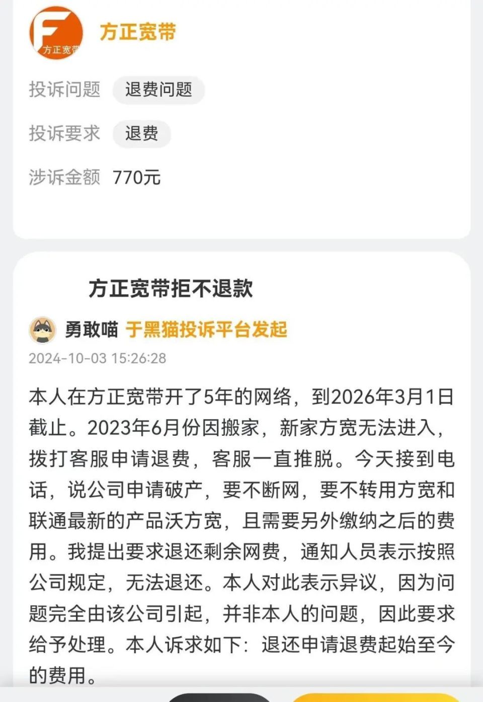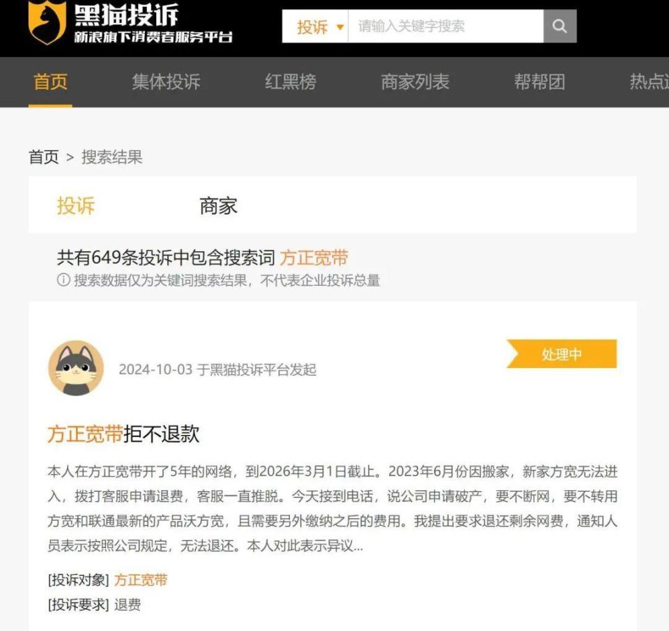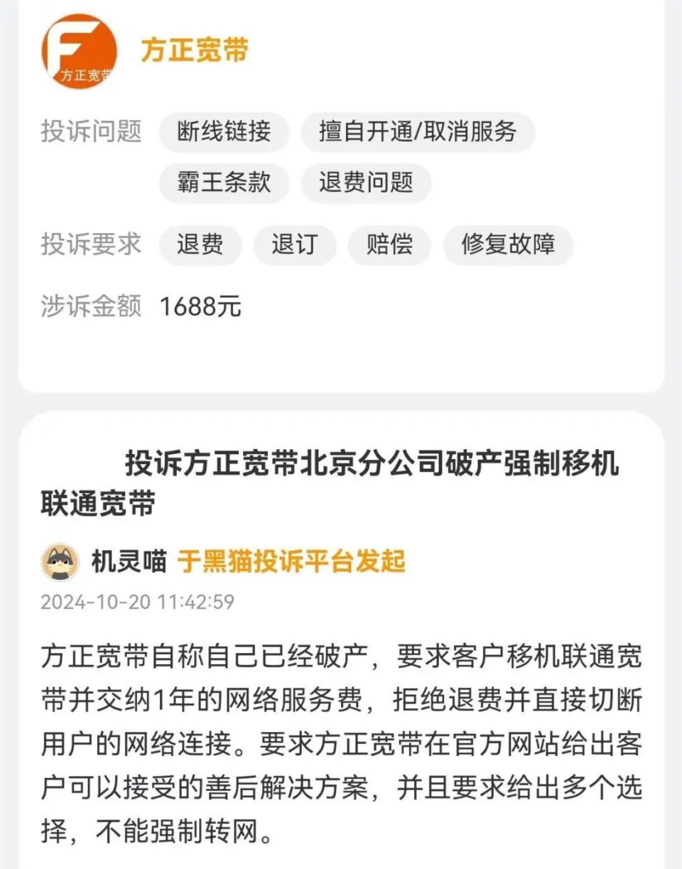 百万用户被“网”住 用户权益如何保障? 记者在黑猫投诉平台搜索关键词“方正宽带”,出现了600多条投诉记录,“加钱才能继续上网”、“不退费断网”等是投诉的关键词,记者此前在和方正宽带工作人员电话沟通过程中,对方透露在京涉及退费的用户不在少数。