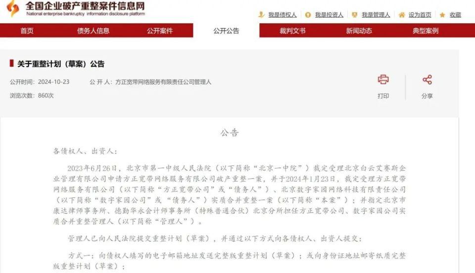 黑猫平台相关投诉/图片来源于网络 这名工作人员所说的用户数量并不是官方数字,但可以确定的是,确实有很多用户都面临着退费的困境。记者查询发现,方正宽带网络服务有限公司曾是方正科技集团股份有限公司的子公司,2022年12月被北京白云艾赛斯企业管理有限公司(该公司成立于2022年11月29日)拍卖收购。半年后,北京市第一中级人民法院于2023年6月26日裁定受理北京白云艾赛斯企业管理有限公司申请方正宽带公司破产重整一案,并且为其指定了重整管理人负责其重整期间的各项工作。目前方正宽带公司处于何种状态呢?北京市同创律师事务所合伙人刘悦律师根据其查到的资料介绍:
