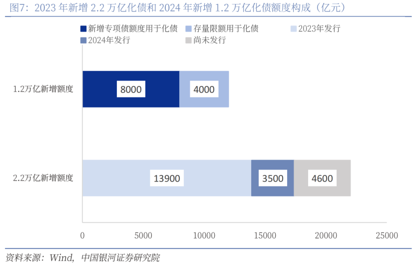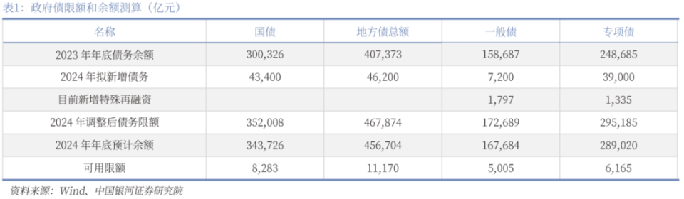 五、目前可盘活的政府债务限额还有多少? 自去年人大常委会审批调整后,截止目前我国中央国债总限额为35.2万亿元,地方政府债务合计限额为46.78万亿元,其中地方一般债债务限额为17.27万亿元,地方专项债限额为29.52万亿元。 根据财政部数据显示,截止2023年年底国债余额为30.03万亿元,地方一般债余额为15.87万亿元,地方专项债余额为24.87万亿元,根据年初预算草案安排,今年拟发行的国债规模为3.34万亿元、超长期特别国债1万亿元,地方一般债0.72万亿元,专项债3.9万亿元。此外,今年额外净融资的特殊再融资债务有3000多亿元,其中特殊再融资一般债1797亿元,特殊再融资专项债1335亿元。按照今年债券发行安排和新增的特殊再融资债券安排,合计国债余额和地方余额或分别为34.37万亿元、45.67万亿元,对比35.2万亿元、46.78万亿元的债务限额,总计还有约8283亿元国债限额和1.1万亿元地方政府可用限额,其中一般债可用限额5005亿元,专项债可用限额6165亿元。 但需要注意的是,地方1.1万亿可用限额中实际还包含了去年批复的4600亿元未使用完毕的特殊再融资债务额度,和今年10月份新增的4000亿元化债额度,扣除以上额度后实际剩余可用地方限额仅2570亿元。实际上,这也是为何今年年底财政部拟一次性增加债务限额的主要因素,即实际可用地方限额空间已经较低。 此外,中央国债的债务限额则相对充裕,8283亿元的债务额度或可部分用来弥补今年一般公共预算的收支缺口(我们测算全年一本账收入缺口约在1万亿左右,详见报告《财政发力推动底层逻辑重构》),这部分资金不需要经过全国人大常委会审批。