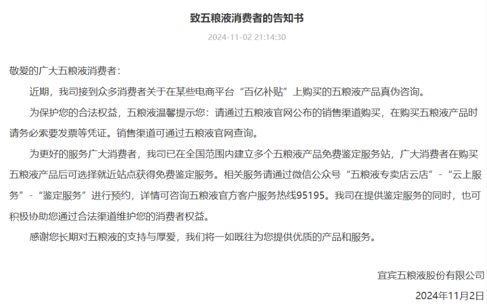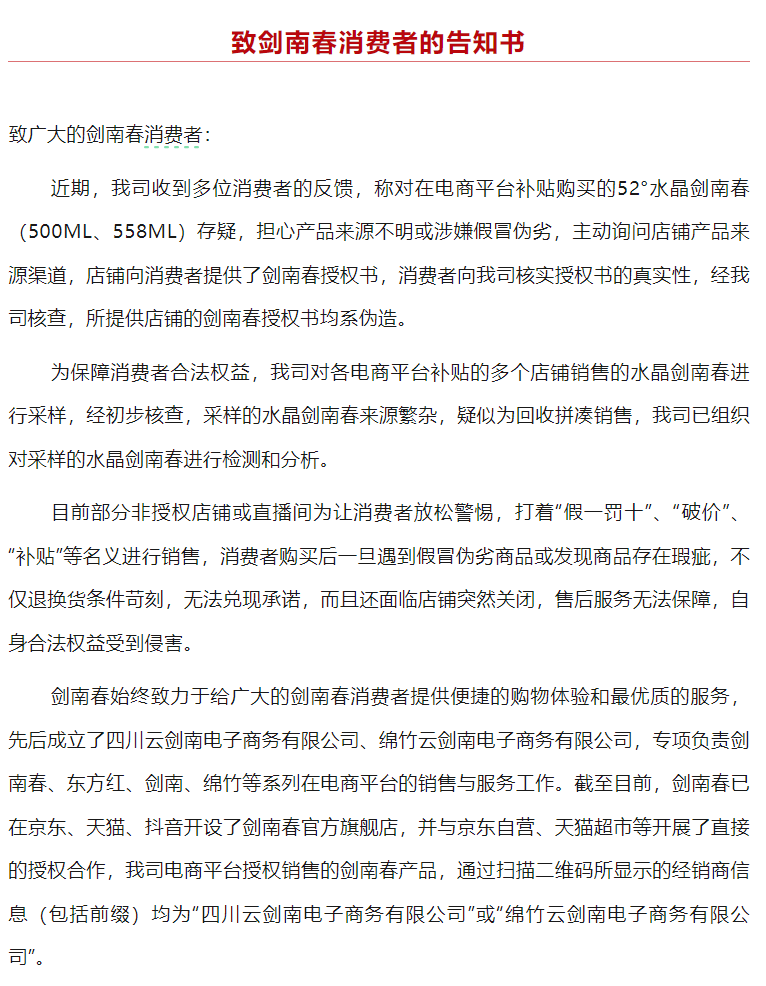 11月2日,五粮液(000858.SZ)发布《致消费者的告知书》,公司表示最近接到众多消费者关于在某些电商平台“百亿补贴”上购买的五粮液产品真伪咨询,并建议消费者通过五粮液官网公布的销售渠道购买,在购买五粮液产品时务必索要发票等凭证。 来源于五粮液官网 就在11月1日,五粮液发布了《关于五粮液电商销售渠道的声明》,将五粮液授权的电商渠道公布,包括京东五粮液官方旗舰店、天猫五粮液官方旗舰店、京东平台上的也买酒官方旗舰店、唯品会自营APP以及盒马自营APP等超50个电商购买渠道。 五粮液部分官方授权的电商销售渠道,来源于公司官网 同时,公司表示为更好服务消费者,五粮液已在全国范围内建立多个五粮液产品免费鉴定服务站,消费者在购买五粮液产品后可选择就近站点获得免费鉴定服务,相关服务可通过微信公众号“五粮液专卖店云店”-“云上服务”-“鉴定服务”进行预约。 南都湾财社记者注意到,这不是五粮液第一次就电商平台发声。今年3月份时,五粮液也表示,公司接到多名消费者关于低价从某电商平台上购买的五粮液产品真伪咨询;经核实,某电商平台上多家店铺销售的五粮液产品为假冒,相关行为严重损害公司声誉以及消费者权益,建议公司在其官网公布的授权电商渠道购买产品。 同时五粮液表示公司将持续对电商平台店铺销售假冒五粮液产品的行为进行清查,一旦发现违法店铺,公司将对其采取行政举报、投诉或司法途径严肃追究其法律责任。 无独有偶,剑南春也在双十一前夕针对电商“补贴”发声,公司于10月18日发表《致消费者告知书》表示,目前存在电商平台店铺的剑南春授权书是伪造的现象,经核查,采样的水晶剑南春来源繁杂,疑似回收拼凑销售,公司已组织对采样的水晶剑南春进行检测和分析。 来源于剑南春官微 剑南春进一步指出,目前部分非授权店铺或直播间为让消费者放松警惕,打着“假一罚十”“破价”“补贴”等名义进行销售,消费者购买后一旦遇到假冒伪劣商品或发现商品存在瑕疵,不仅退换货条件苛刻,无法兑现承诺,而且还面临店铺突然关闭,售后服务无法保障,自身合法权益受到侵害。 显然,从五粮液、剑南春等声明来看,消费者要确保买到真酒,还得认准酒企官网公布的授权店铺。此外,双十一促销背景下,酒企密集发声背后,还是在于“稳价”。 酒业分析师蔡学飞就对南都湾财社记者表示:“茅台五粮液剑南春等名酒企的明星产品,市场需求大,产品流通性好,变现能力强,因此是平台销售引流的大品类,而低价是电商导向引流、刺激用户消费的惯用方法,在目前电商如此内卷的竞争环境下,平台相应补贴不断加大,低价会冲击企业好不容易建立的价格体系。” “因此在关键时段,酒企主动进行市场检查,规范市场经营,具有维护消费者权益、保证企业正常经营等积极价值。”蔡学飞继续说道。 南都·湾财社记者 张海霞 来源:https://view.inews.qq.com/k/20241104A0584800 免责声明:如果侵犯了您的权益,请联系站长,我们会及时删除侵权内容,谢谢合作! |
