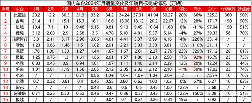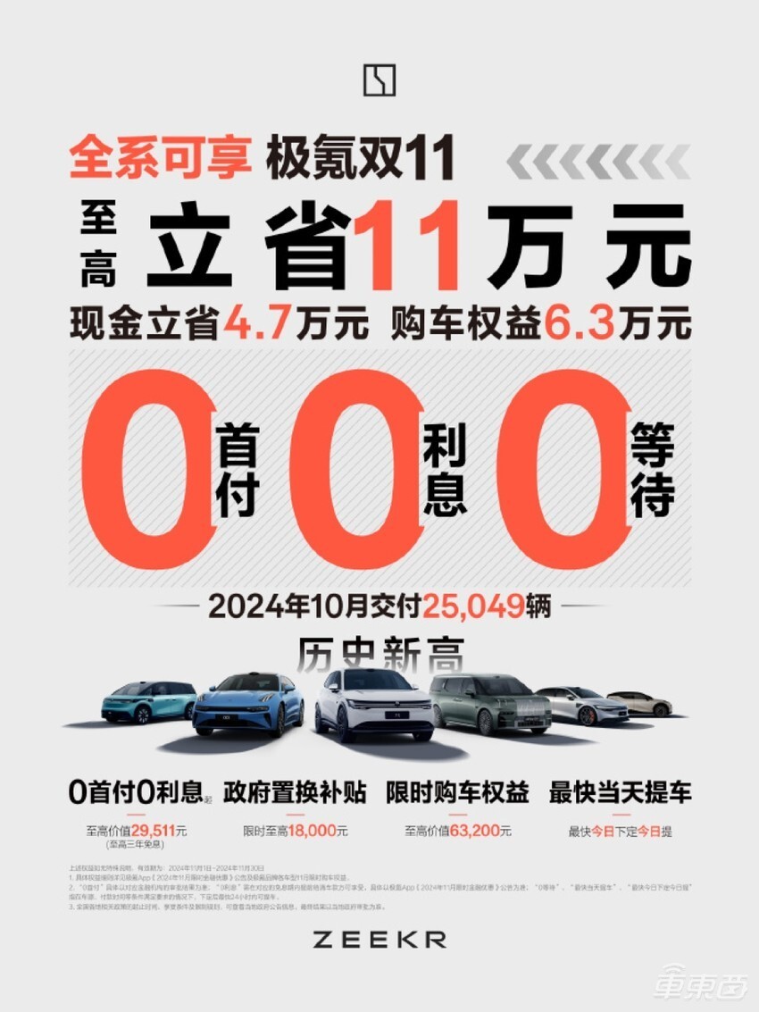 作者 | R 编辑 | 志豪 “金九银十”落下帷幕,但车企的优惠促销却远未结束。 车东西11月4日消息,近日,多家车企推出了11月优惠政策,鸿蒙智行、零跑汽车和极氪都接连发布了11月优惠政策,问界M9五座版最高能给出近5万元的购车权益,极氪更是喊出立省11万的口号。 ▲鸿蒙智行官方宣布购车权益 而上汽集团则全体出动参与优惠,旗下13个子品牌全部参与优惠,最高也给出了12万元的优惠。 11月份刚开始,车企在价格战中就都纷纷亮出了刺刀,已经有上百款车型开始了新一轮的价格战。 在刚刚过去的10月,车企们可以说是度过了一个火热的“银十”,至少11家车企在10月份达到了销量新高,但仍然距离完成年销量目标有一定差距,而车企们选择在11月一开始就集体放出新优惠政策,继续冲击年销量目标。 ▲国内主要车企2024年月销量变化 一、问界购车权益可达5万元 上汽13个品牌齐优惠具体来看,鸿蒙智行给旗下的所有车型详细的列出了购车权益,其中问界M9五座版的购车权益可达49999元,包括ADS高阶功能包补贴、10000元选配权益等。 ▲问界M9五座版购车权益 此外,问界的另一款热门车型问界M7也有至高38800元的限时购车权益,同样包括ADS智驾功能升级权益和选配权益等。 ▲问界M7限时购车权益 此外,鸿蒙智行旗下的其他车型包括问界M5、智界R7、智界S7、享界S9都有不同幅度的购车权益。 零跑汽车也在11月给出了全新的优惠政策,根据零跑汽车官方的说法,零跑C16车型11月购车下定至高可省4万元,包括国家置换补贴和品牌增换购补贴(2.5万元),以及金融礼、选装礼、补能礼、等待礼等。 C10车型下定至高可省43630元,提供国家置换补贴和品牌增换购补贴(2.9万元),C11和C01车型下定至高可省37630元,国补和品牌补贴共2.6万元。 T03下定可省至高30680元,国补加品牌补贴同样为2.6万元,此外,每款车型还将提供整车终身质保、免费三电质保、车机基础流量终身免费等权益。 ▲零跑汽车11月购车权益 极氪也以借双十一活动的名号开启了优惠,表示全系车型0首付0利息0等待,至高立省11万元,其中也包括了政府置换补贴和限时购车权益等优惠政策,同时最快当天提车。 ▲极氪宣布开启优惠 而关于政府补贴方面,近日上海市正式新增了汽车领域以旧换新消费政策《上海市进一步加力支持汽车以旧换新补贴政策实施细则》。 ▲《上海市进一步加力支持汽车以旧换新补贴政策实施细则》 至2024年12月31日,消费者在上海通过旧车置换购买纯电动车或燃油车,符合特定条件的情况下可享受政府一次性1.5万元或1.2万元补贴,均不限沪牌。 而作为上海本地企业的上汽集团,也是顺势推出了一波优惠政策。 ▲上汽集团官宣开启优惠 上汽集团旗下智己、荣威、飞凡、MG、大通、五菱、宝骏、奥迪、大众、斯柯达、凯迪拉克、别克、雪佛兰13个整车品牌的百余款车型,最高优惠可达12万、低至五折,且上海市内200余家上汽品牌门店均参与。 据了解,此次上汽旗下参与活动的车型,在叠加以旧换新补贴后,整体优惠幅度可达五至八折,同时还特别推出了300多辆“限量彩蛋车”,单车优惠金额最高可达12万元,免首付、免利率、免保险,现金优惠、置换补贴、终身免费保养。 总的来看,这些车企推出的11月优惠政策普遍以政府补贴叠加多种购车权益为主,整体来看优惠政策的幅度还是比较大的。 二、延续“金九银十”热度 冲刺全年目标那么,在“金九银十”刚刚过去的11月初,车企们为什么要纷纷推出这么多重磅的优惠政策呢?首先来看17家国内车企发布的“银十”销量战报。 ▲国内主要车企10月销售战报发布 其中,比亚迪月销首次来到50万台,在9月份突破40万辆销量大关后,仅用了一个月的时间,就实现了一月卖车50万辆。 不仅如此,比亚迪、吉利、长城、零跑、深蓝、小鹏、小米、岚图、智己、、极越共计11家车企在10月份也达到了销量新高。 仅有理想汽车和蔚来汽车10月销量呈现小幅微跌,但都分别保持了5万台、2万台以上的市场份额,整体较为稳定。 如此成绩可以说是十分火爆了,而车企们自然也是想“趁热打铁”,来进一步维持10月的热销表现,冲刺全年销量目标。 同时,有些车企可能也有其他方面的考虑。 上汽集团还没有发布其全部品牌的10月份整车销售数据,但根据其2024年9月份整车销售数据来看,上汽集团9月销售新车31.3260万辆,同比下降了35.03%。 ▲上汽集团9月整车销售数据 从数据来看,除智己汽车和新能源汽车板块,上汽集团旗下各车企9月销量全部同比下跌,其中降幅最大的上汽通用9月销量更是同比暴跌77.95%,9月份累计销量只有22051辆。 今年1至9月,上汽通用累计销量只有278485辆,远低于去年同期的724259辆,同比大跌61.55%。 其他品牌方面,上汽大众9月累计销量94000辆,同比减少21.67%,今年1至9月,上汽大众累计销量772091辆,同比减少7.24%。 上汽乘用车销量跌幅也很大,9月累计销量只有54366辆,同比大跌41.12%,今年1至9月,上汽乘用车累计销量481311辆,同比下降26.01%。 而上汽集团中9月销量最高的上汽通用五菱,其累计销量为110000辆,但同比依然下跌了18.52%。 今年1至9月,上汽通用五菱累计销量840009辆,同比下跌5.23%,这已经是上汽集团旗下主要品牌中销量跌幅最小的车企。 整体来看,上汽集团9月份整车销售数据可以说基本上所有品牌同比下降,而唯一上涨的品牌智己汽车,也是由于其去年同期销量只有1805辆,基数较