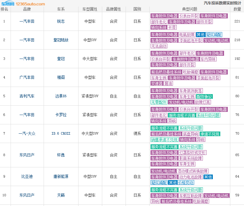据《车质网》最新投诉数据显示,榜单前十名品牌分别为一汽丰田、广汽本田、吉利、一汽-大众、东风日产、比亚迪。其中,一汽丰田旗下上榜前10名的车型有锐志、皇冠陆放、皇冠、卡罗拉等车型,这些车型的投诉量分别为223起、218、192起、76起。投诉量与9月相比都增加了,特别是一汽丰田的皇冠与皇冠陆放等车型在这个月的投诉量与9月相比增加了近一倍。 从投诉皇冠车型的问题来看,大多集中在车身附件及电器、部件老化、仪表台开裂、转向系统灯问题。有车主投诉表示:一汽丰田皇冠仪表台开裂掉皮发粘通病还有异车味,没有任何回复,要求厂家更换解决。实际上,关于皇冠车型部件老化这一投诉问题一直都存在很久了,但或是由于部分车型款式比较老及停产使得仪表台开裂掉皮发粘等问题一直得不到有效的解决。 皇冠陆放的投诉量在这个月也是增长较快的。从投诉的问题来看,大部分投诉依旧是反映一汽丰田皇冠陆放车辆电瓶故障问题。从投诉的车型来看大多都是2024款 2.5L HEV 四驱 尊贵版车型。有网友发帖称:车辆突然电瓶亏电,车门无法打开,车辆无法启动车。还有网友表示,自己在今年8月15日购车,但在9.26日就出现车车子完全没有电,无法打开车门的情况,当时联系了4S店。第二次是10.7日又是无电日,前一天都有开车,从来都没有听说过新车打不开门的,亏电成这样的。对于网友们的反映,一汽丰田也在帖子下方回应表示:已经收到问题,建议与经销店保持沟通。 此次位列投诉榜前十排名第二位投诉品牌是东风日产,涉及投诉的车型为轩逸和天籁。两款车型被投诉的内容主要为服务流程不完善、车身附件及电器、系统升级等问题。除了上述车型外,位列前十投诉榜的车型还有吉利汽车的远景X6,投诉的问题主要是车身附件、电器车身装饰脱落及发动机故障等问题。一汽-大众的ID.6 CROZZ车型此次也进入了投诉榜前十位置,排在第七位置,投诉的问题为服务流程不完善、系统升级问题、销售承诺不兑现及转向系统异响等问题。 排名投诉第9的车型是比亚迪的唐新能源,投诉的主要问题是价格变动方面。值得一提的是,从榜单前三十的车型来看,比亚迪上榜的车型除了唐新能源外,还有秦PLUS、宋PLUS新能源、元PLUS等车型,投诉的大致内容也是关于价格优惠方面的。有车主投诉发帖称:自己在2024年1月18日购买了新车,当时该车指导价价21.98万网(指导价优惠1.5万),2024年2月末同款车指导价18.98直降3万,在如此短的时间内大幅降价,这让老车主难以接受。 实际上,自今年2月以来,比亚迪就陆续推出不少荣耀版,新版本与旧版车型相比系统配置方面进行了升级,售价方面也下降了不少。这一系列新产品的上市,由于价格方面的优惠也引起了不少老车主们的不满。不过官方推出新款车型,价格下降的情况在汽车行业中并不少见。不过最好在优惠车型推出前,给予老车主一些关怀政策,或许有利于安抚到老车主们。 总的来看,10月的投诉榜单与9月相差不大,一汽丰田车型的投诉量依旧是占据了投诉榜单前十大部分的位置。汽车作为大宗消费品,投诉问题也受到了不少消费者的关注。对于一汽丰田来说,后续该如何解决这些投诉是关键,不然对于口碑也将造成一些不好的影响。 汽车行业关注 人气汽车新传媒 每天分享有价值的汽车新闻 汽车人的平台 来源:https://view.inews.qq.com/k/20241103A06GY200 免责声明:如果侵犯了您的权益,请联系站长,我们会及时删除侵权内容,谢谢合作! |