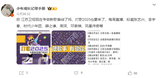 近年来,音综节目成为了无数网友空余时间消遣娱乐的首选,今年芒果台重启《歌手2024》取得巨大成功后,浙江卫视推出了《有歌2024》,而江苏卫视明年也会推出全新音综《打歌2025》,拟邀嘉宾名单曝光,周深邓紫棋收到邀请。 全开麦,打新歌 与《歌手》和《有歌》等节目不同,《打歌2025》将带来全新的节目形式。歌手们在节目中不是演唱已有的歌曲,而是带来全新未发表的新歌,并且是以全开放麦直播的形式进行。这种形式不仅能够展示歌手的现场实力,还能让歌手的新歌得到更广泛的关注和传播。 拟邀嘉宾阵容强大 《打歌2025》的拟邀嘉宾名单中,除了周深和邓紫棋外,还包括了张艺兴、李宇春、时代少年团、薛之谦、凤凰传奇等多位知名歌手和团体。这些歌手和团体在音乐界有着广泛的影响力和号召力,他们的参与无疑将为节目增添不少看点。 李宇春是通过芒果台选秀节目出道的歌手,近年来也是各大音综和晚会的常客。而薛之谦则是通过东方卫视选秀出道的歌手,他也是一位专注于创作的歌手,有他的加入王阳明肯定会非常期待。 张艺兴是通过韩国男团EXO出道的歌手,他回国后因参加东方卫视的《极限挑战》人气大增,近年来他也经常出现在音综节目中,而参加打歌音综节目,他的粉丝们都非常期待。 周深和邓紫棋的加盟备受期待 周深以其独特的音色和深情的演绎,赢得了广泛的关注和喜爱。近年来周深也是各大音综的常客,他参加网友们也都非常期待。 邓紫棋则以其强大的创作能力和震撼的高音著称,作为香港小天后的她,也是一位创作型歌手,她有很多经典的歌曲,因此不少网友期待她能够参加,带来更多新歌。 两人的加盟,使得《打歌2025》备受期待。他们不仅能够带来精彩的表演,还能为节目带来新的话题和关注度。 组合阵容更强大 拟邀阵容中还有两个组合,分别是时代少年团和凤凰传奇。时代少年团是内地的一支男子演唱组合,由马嘉祺、丁程鑫、宋亚轩、刘耀文、张真源、严浩翔、贺峻霖七人组成,目前他们的人气非常高。 这个年轻的组合以其青春活力和音乐才华迅速在亚洲娱乐圈中崛起。他们的音乐作品充满了正能量,传递着年轻人的梦想和追求。时代少年团的成员们不仅在音乐上有着出色的表现,在综艺节目中也展现出了他们的多才多艺和亲和力。 凤凰传奇是一支可以归结为跨界的组合,他们对音乐的处理包含简单的说唱、电子、舞曲和民歌的结合,使得歌曲更利于在广大群众生活中传唱,实际上也是一种对民歌的传承。 凤凰传奇的音乐作品广为传唱,成为了很多人心中永恒的经典。他们的歌曲旋律优美、节奏明快,歌词富有诗意和深意,深受听众喜爱。凤凰传奇的音乐作品不仅在国内广受欢迎,也在国际上获得了广泛的认可和赞誉。 今年是凤凰传奇出道20周年之际,他们也正式启动了《吉祥如意》巡回演唱会,这不仅是对过去二十载的回顾与庆祝,也是对未来的向往与期待。他们的演出现场总会给观众带来惊喜体验,年轻群体不断感慨“血脉觉醒”,作为观演主力军,90后、00后在凤凰传奇的演出现场跟自己的童年相遇重逢,为自己的情绪找到了最酣畅淋漓的输出方式。 总体而言,江苏卫视的《打歌2025》以其创新的节目形式和强大的嘉宾阵容,成为了明年最受期待的音乐综艺节目之一。节目的直播形式和原创新歌的呈现,将为观众带来全新的视听体验。让我们一起期待《打歌2025》的播出,感受音乐的魅力和歌手们的风采。 查看详情:https://view.inews.qq.com/k/20241106A03MJO00 免责声明:如果侵犯了您的权益,请联系站长,我们会及时删除侵权内容,谢谢合作!  |