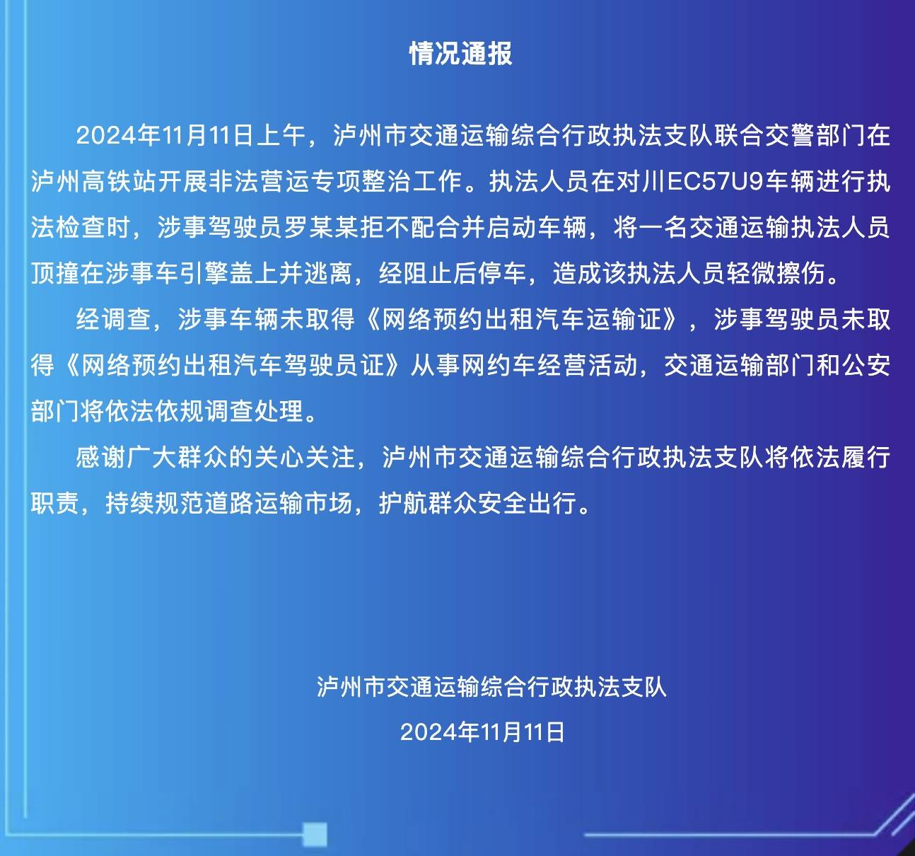 新京报讯 据泸州交通官微消息,2024年11月11日上午,泸州市交通运输综合行政执法支队联合交警部门在泸州高铁站开展非法营运专项整治工作。执法人员在对川EC57U9车辆进行执法检查时,涉事驾驶员罗某某拒不配合并启动车辆,将一名交通运输执法人员顶撞在涉事车引擎盖上并逃离,经阻止后停车,造成该执法人员轻微擦伤。 经调查,涉事车辆未取得《网络预约出租汽车运输证》,涉事驾驶员未取得《网络预约出租汽车驾驶员证》从事网约车经营活动,交通运输部门和公安部门将依法依规调查处理。 感谢广大群众的关心关注,泸州市交通运输综合行政执法支队将依法履行职责,持续规范道路运输市场,护航群众安全出行。 泸州市交通运输综合行政执法支队 2024年11月11日