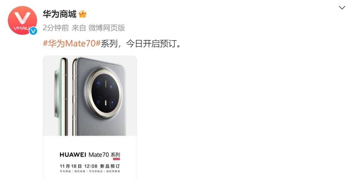 | 每经AI快讯,据华为商城官方微博刚刚发布的消息,华为Mate70系列,今日开启预订。 海报显示,预订开启时间为11月18日12:08。