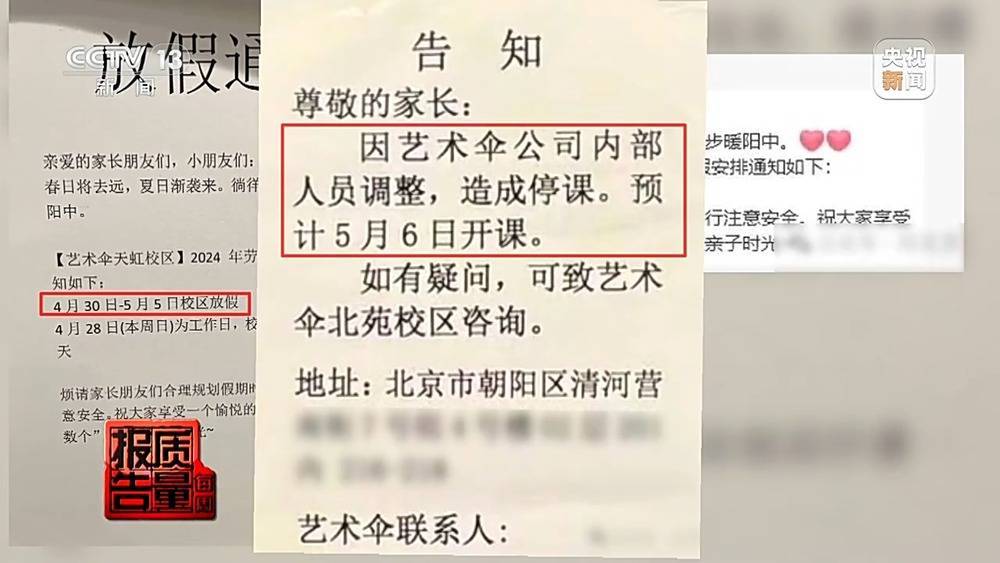 据记者了解,北京艺术伞连锁培训机构的注册名称是北京小蕃茄教育咨询公司,成立于2012年,主要为2-14岁少儿提供美术、书法、陶艺培训课程,规模最大时在北京开设过9家门店。 “五一”前夕,艺术伞连锁培训机构的各个门店都贴出了放假公告,给出的理由各有不同,像清河校区告知家长的理由是因为人员调整造成停课,预计将于5月6日开课。而在肖家河校区的微信通知里面,4月26日声称由于校区电线线路出现故障,需要维修造成停课,到了4月28日则声称,接到高层领导通知,5月6日复工上班。