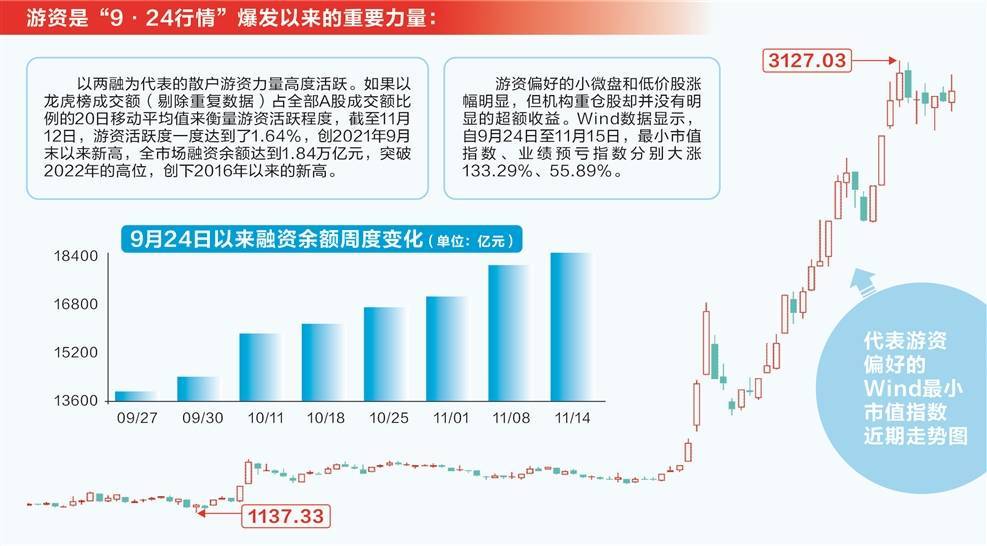 机构和游资、基本面和情绪、长线资金和短线资金……几组对比鲜明的关键词悄然成近期市场的关注焦点。 上周,A股发生了明显的缩量回调,尤其是一些前期强势的“游资票”大幅回落。近期机构重仓股的相对低迷和“游资票”行情的此起彼伏,还引发了市场关于定价权是否已经从机构投资者转移到散户游资等高风险偏好资金的讨论。 不可否认的是,近期市场呈现出明显的游资主导特征,多家机构在采访中认为,“游资行情”的崛起反映出当下市场情绪和流动性大幅修复,但定价权是一个多方合力、动态平衡的过程,不能简单判断谁对市场定价,一个健康的资本市场生态需要机构投资者和个人投资者共生共长、长线资金和短线资金各得其所。 游资活跃度达到历史峰值 游资是“9·24行情”爆发以来的重要力量,尤其在10月9日以来的行情中占据主导地位。 一方面,游资偏好的小微盘和低价股涨幅明显,但机构重仓股却并没有明显的超额收益。Wind数据显示,自9月24日至11月15日,最小市值指数、业绩预亏指数分别大涨133.29%、55.89%,艾融软件、大地电气等小微盘股大涨超500%,但同期基金重仓指数仅上涨了28.47%,明显跑输万得全A指数30.59%的涨幅,涨跌幅与市值大小呈现出明显的负相关性。 另一方面,以两融为代表的散户游资力量高度活跃。如果以龙虎榜成交额(剔除重复数据)占全部A股成交额比例的20日移动平均值来衡量游资活跃程度,截至11月12日,游资活跃度一度达到了1.64%,创2021年9月末以来新高,全市场融资余额达到1.84万亿元,突破2022年的高位,创下2016年以来的新高。 国投证券策略首席林荣雄在研报中指出,自“9·24行情”爆发以来,我们可以看到两股明确的增量资金,一是在国庆节前后以权益ETF为代表的被动多头崛起,二是近一个月以两融为代表的散户游资力量的崛起。 对此,排排网财富理财师姚旭升在接受证券时报记者采访时表示,10月以来游资行情的崛起,主要原因包括以下几点: 第一,当前市场整体流动性较为宽松,经济复苏预期增强,尤其在新兴产业发展的背景下,小微盘和低价股的吸引力显著提升,为游资的活跃提供了条件;第二,近期A股市场散户资金占比显著增加,这些资金往往追求短期内的快速收益,与游资的短线操作策略相契合;第三,市场情绪亢奋,投资者对短期炒作的偏好增强,为游资提供了良好的操作环境;第四,美国总统大选等宏观事件,为游资提供了炒作题材。 “流动性是叙事的温床,9月24日以来,市场情绪的高亢和流动性的充裕,为游资提供了操作的空间;另外,游资更偏好主题性投资机会,对基本面的关注度不如机构投资者那么细致,这种情绪和资金的集中进场,推动了市场的普涨阶段,随后进入分化阶段,特别是计算机、传媒等风险偏好高的板块表现较好。”财通基金进一步表示。 汇丰晋信基金总结认为,市场在不同阶段往往会展现不同的风格,比如当市场处于流动性推动的反弹阶段时,小盘题材股往往会主导行情。当前政策对经济托底修复的态度明显,但基本面的改善仍需要时间验证,市场难以形成稳定的一致预期,因此短时间可能无法形成合力,而游资擅长的小微盘股行情崛起更多反映了市场情绪的显著修复。 定价权是各方合力形成 值得注意的是,随着游资行情不断走高,关于机构与游资争夺定价权的讨论也越来越多。 比如林荣雄认为,长期以来,机构资金以及审美类似的北向资金拥有A股市场的主要定价权,但9月底反弹以来,偏股型基金整体取得了一定绝对收益,但是并没有获得超额收益,这说明短期内市场主动权从主动型公募机构和外资转移到了散户游资等高风险偏好资金以及ETF为代表的被动多头资金。 实际上,在大部分机构人士看来,游资和机构的持仓差异较大,并不涉及定价权的争夺问题。在A股以散户为主的市场中,散户、游资、ETF、险资等参与主体复杂多样,合力形成的共振也呈现出多样性,市场定价权也是一个动态平衡的过程。 财通基金认为,机构和游资在投资风格和喜好上存在明显差异。机构偏好稳健,而游资偏好激进,导致游资参与为主的股票波动幅度较大,机构参与多的股票则表现相对稳健。“市场定价权这个概念,阶段性是由增量资金来决定的,但拉长维度来看,成长价值依旧是投资的主线,所以不能简单地说谁对市场定价,从长远来看,价值对市场定价。”财通基金表示。 上海一位公募量化基金经理也表示,游资和机构持仓差异较大,游资对其买卖的标的价格会有一定的定价权,而对机构持仓影响不大;只是当前市场环境,游资增量资金相对较多,对游资偏爱的股票有一定影响。 上述基金经理补充认为,市场定价权受多种因素综合影响,包括市场环境、市场参与者、增量资金等,而且在不同的市场环境,不同因素的影响力度不一样。随着稳增长政策逐步落地,经济基本面有望企稳回升,A股市场未来也有望长期向好,机构投资者偏好的、基本面过硬的绩优股将更可能获得资金青睐。 “在A股市场,各类参与主体复杂多样,任何合力都有可能形成定价权。市场的定价权并非静态,而是随着资金流动和市场情绪的变化而不断演变,这是一个复杂且动态的过程,涉及多种市场参与者和多种因素。在某些特定时期,游资和散户的影响力可能上升,但这并不意味着定价权的改变,机构与游资之间更多是博弈关系而非直接争夺。” 姚旭升表示。 姚旭升认