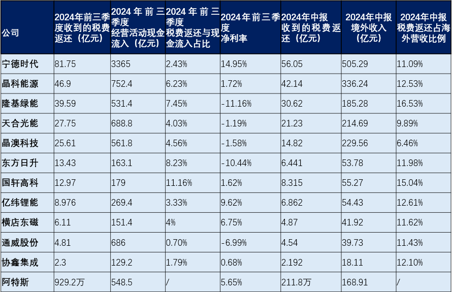 赶碳号根据各家公司三季报、半年报整理 梳理完上面这张表,赶碳号有点替一些企业冒汗了。在财务三张表中,出口退税这一项,以“收到的税费返还”的形式,体现在现金流量表中。当然,税费返还不只包括出口退税这样的税收优惠,也包括企业所得税税收优惠返还、鼓励技术创新的增值税优惠等。对于光伏电池组件企业来说,绝大部分是出口退税。 看一家光伏、储能企业的税费返还,不能只看绝对额,更要看在经营活动现金流入中的占比,在其海外营收结构中的占比。 由于这次调整退税比例也涉及储能电池,我们也将宁德时代、亿纬锂能、国轩高科三家公司列入统计。一个奇怪的现象是国轩高科,今年前三季度,收到的税费返还占到当期经营活动现金流入的11.16%,是我们统计的所有企业中最高的一家。另外,该公司今年上半年的海外营收为55.27亿元,同期收到的税费返还为8.315亿元,占比高达15.04%,也远超宁德时代与亿伟锂能。