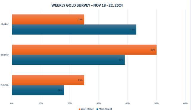 根据Kitco News在周末最新发布的每周黄金调查显示,目前行业专家对黄金在本周的看跌情绪依然强烈,不过不少散户交易员则相对乐观。本周,12位机构分析师参与了Kitco News黄金调查,只有3位专家(占25%)预计未来一周金价将上涨,而6位分析师(占50%)预测黄金价格将再次下跌。其余3位分析师(占总数的25%)预计黄金价格将继续盘整,并呈下行趋势。 与此同时,Kitco的在线调查共收到181票。其中78位散户(占43%)预计金价未来一周将上涨,71位(占39%)预计黄金价格将走低。其余32位投资者(占总数的18%)预计黄金价格近期将横盘整理。