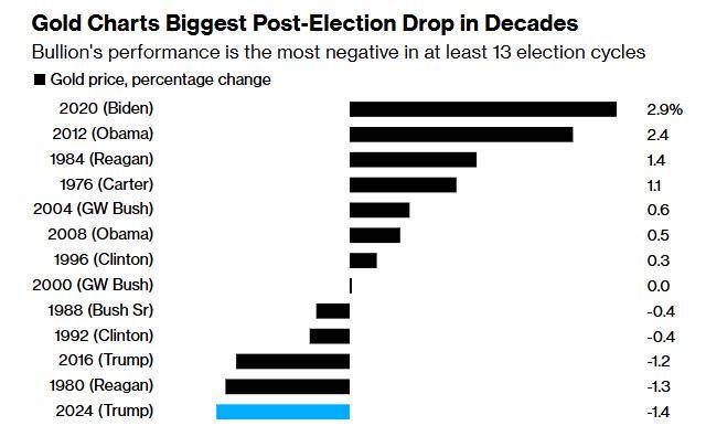 | 财联社11月18日讯(编辑 潇湘)本月,美国候任总统特朗普在大选中的大获全胜,立即提振了从美股到比特币等市场的表现。然而,在一系列选前被热捧的特朗普交易中,黄金显然成为了一个例外…… 德意志银行的数据显示,在特朗普获胜后的两天内,黄金的表现是至少13次美国总统大选窗口期以来最差的。而自大选日以来(截止上周五),金价已下跌了近7%,这与美股、比特币等其他特朗普交易的火热表现形成了鲜明对比。