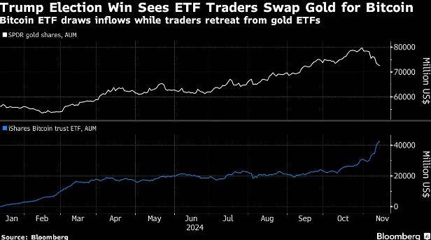 美国银行高级投资策略总监Rob Haworth表示,“当人们对黄金感兴趣之际,往往正是其他投资不再有效时。而眼下,股市运作良好、低评级的公司信贷甚至也获得了稳健的回报。因此,你不太可能想寻求投资组合增长的其他来源。” 由于地缘政治和经济风险吸引了投资者,黄金在美国大选投票前的一年里飙升了30%以上,创下了一个又一个高位纪录。然而,尽管长期的不确定性依然存在,而且特朗普以其时不时的胡乱表态而闻名于世,但当最为看涨黄金的情况——出现选举争议或僵局未能实现后,黄金的避险吸引力在短期内仍很大程度上消失了。 黄金遭遇的阻力 自特朗普胜选以来,美元的大幅上涨也对黄金不利,因为黄金是以美元计价的。与此同时,美国经济状况似乎相当不错,美联储也不急于继续降息。 John Hancock Investment Management联席首席投资策略师Matt Miskin表示,“在当前美国经济形势如此强劲的情况下,投资黄金将是逆势的选择。目前的市场情绪是,基本面和地缘政治风险都非常小。在这种环境下,逆势而为并不容易。” 目前,虽然一些投资者可能并不认同当选总统特朗普的执政纲领,但只要想想在特朗普2.0时期会发生什么,就有助于消除近期的一些不确定性。共和党大获全胜的结果也意味着他将有更多的余地来执行他在竞选时预告的政策。从减税、放松金融监管到关税,特朗普的议程让对冲基金纷纷涌入了那些可能受益的行业,包括大型银行和美国国内工业企业。 Infrastructure Capital Advisors首席执行官Jay Hatfield表示,“我们有比黄金更有吸引力的地方投入资本”,他提到了金融和其他风险较高资产的机会,并举例称“谁会想错过高盛10%的反弹?” 由于人们预期特朗普的政策将提振数字资产,加密货币自美国大选日以来也一路飙升。贝莱德的现货比特币ETF——iShares Bitcoin Trust ETF的总资产规模在上周已首次突破了400亿美元。在比特币ETF资产规模激增的同时,全球最大的实物黄金ETF——SPDR Gold Share则出现了大幅流出。