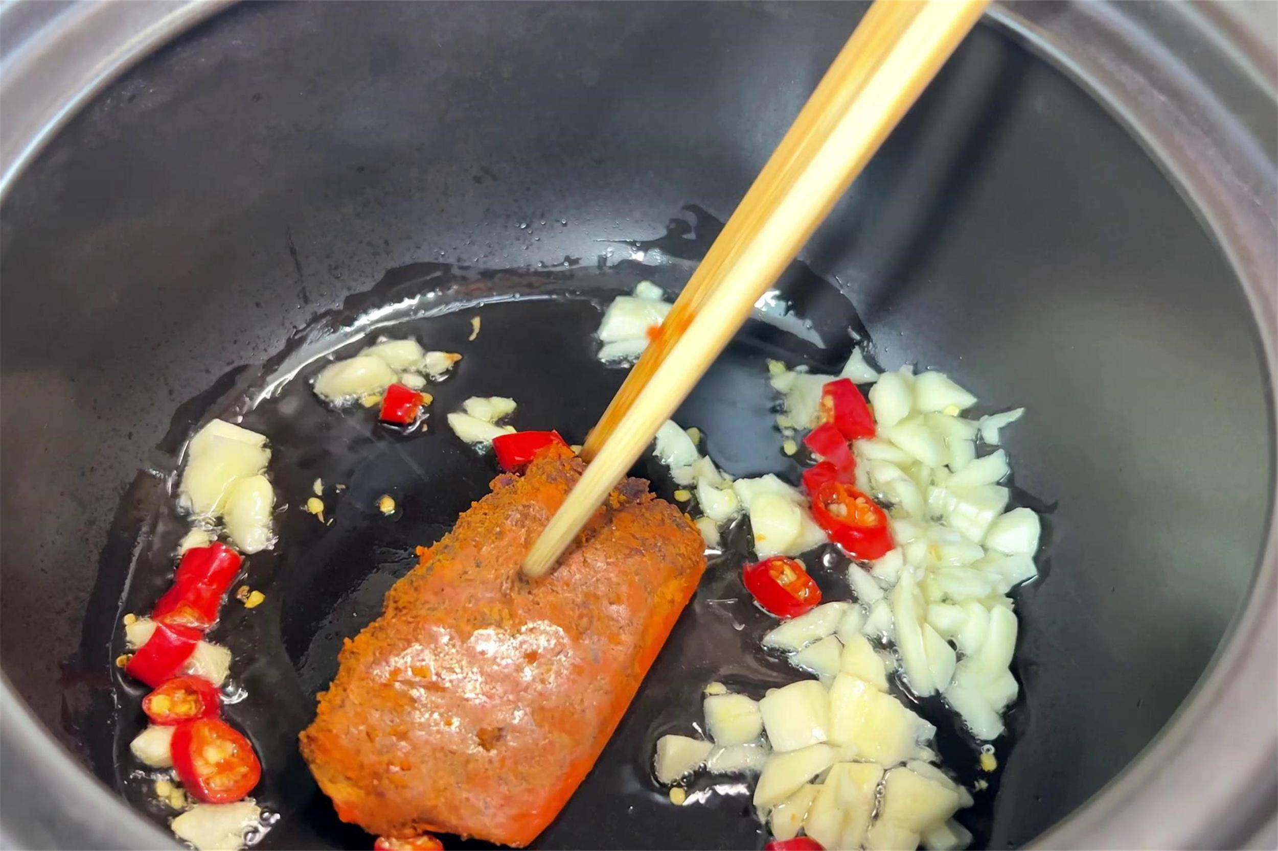3、砂锅中倒油,放入切好的蒜末、小米椒炒出香味,放一块火锅底料,炒至融化。