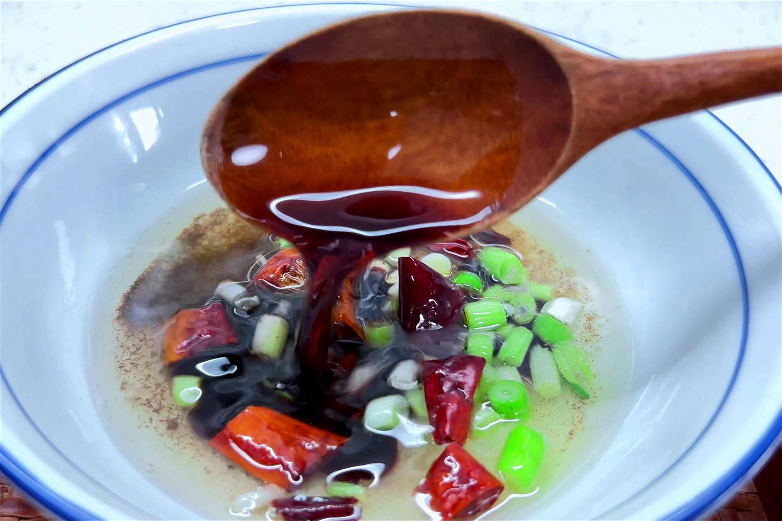 2、洋葱、大蒜、生姜去皮切块,葱白切小段,碗中放一勺黑胡椒、一勺白胡椒,再加半勺白糖和适量的盐,放上葱白和干辣椒段,烧热油淋在上面,加三勺生抽搅拌均匀。