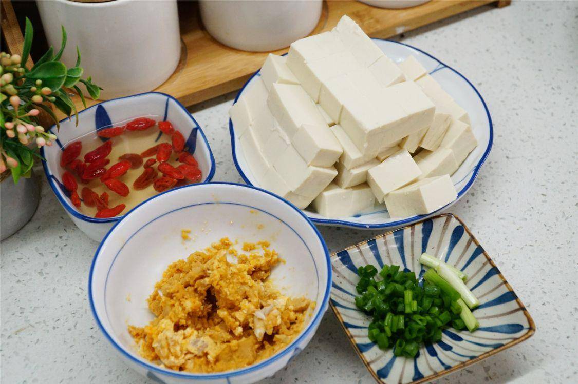 第四道:【砂锅咸蛋黄豆腐煲】所需食材:咸鸭蛋3个、豆腐一块、枸杞一把、小葱一根、姜一块。