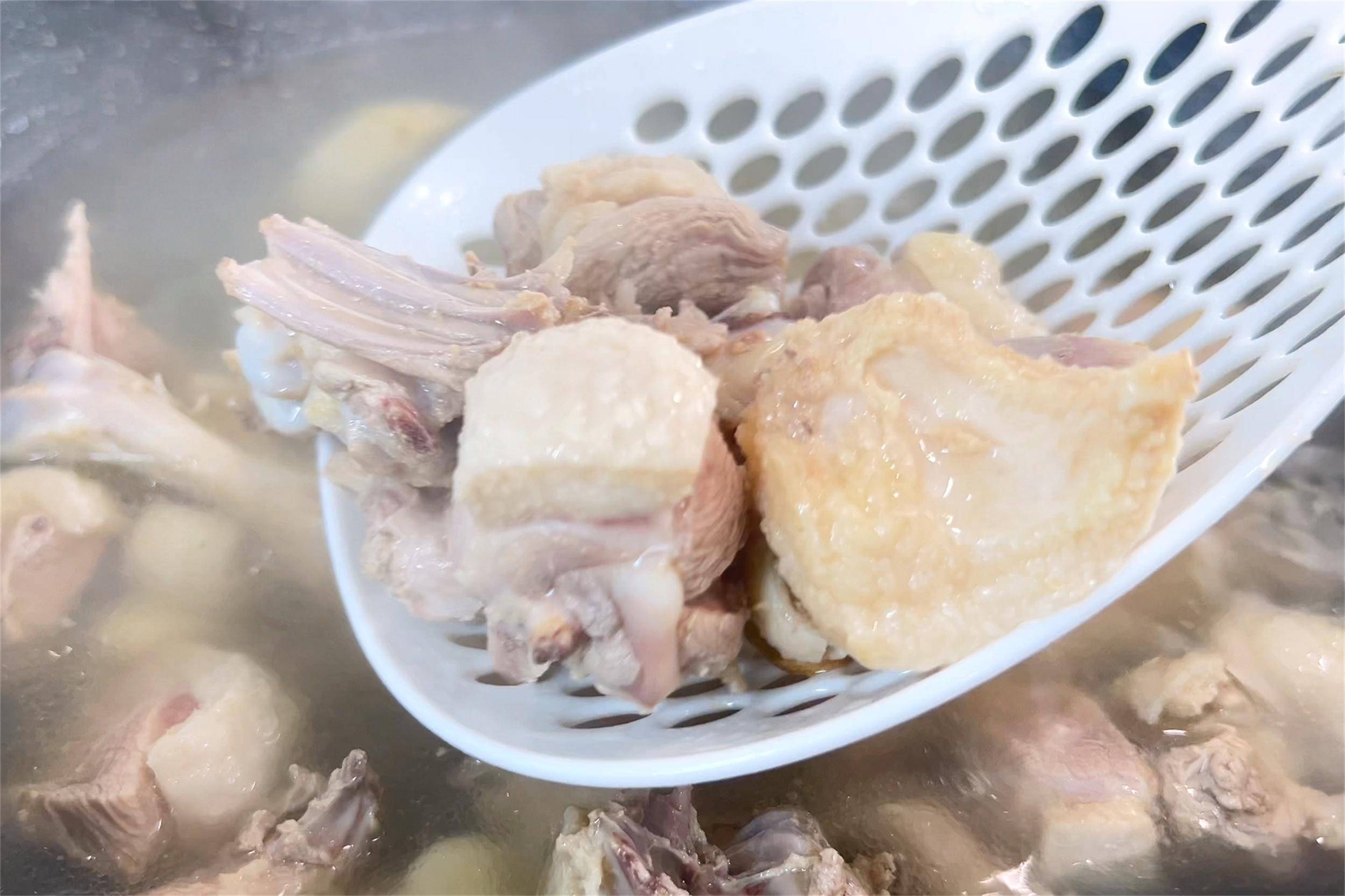 1、新鲜的半只鸭肉冲洗后剁块,把鸭块放进清水中加一勺盐,搓洗浸泡十五分钟,泡出血水洗净。把鸭肉倒入冷水锅里,放姜片和一勺料酒,大火烧开焯煮去腥,撇出浮沫捞出鸭肉,用温水冲洗一遍,控干水分备用。