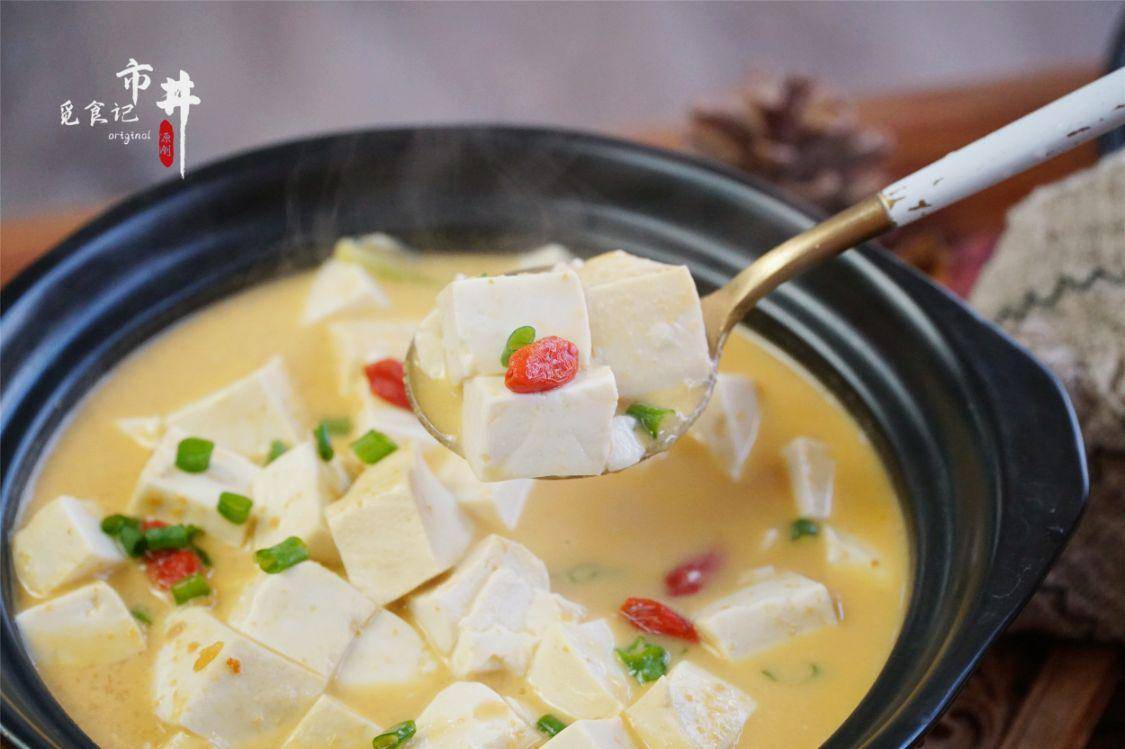 3、倒入一小碗热水,煮开后倒入豆腐块,将食材都转入砂锅中,加入枸杞和适量的盐继续焖煮5分钟即可。